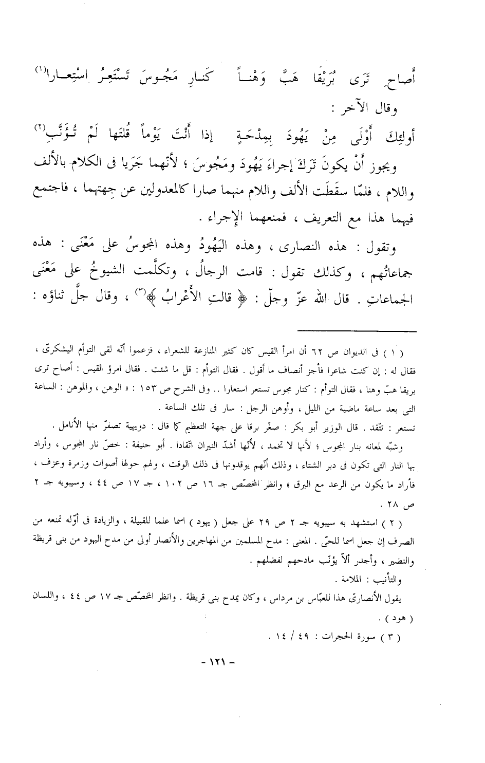 ويجوز أنْ يكون ترك إجراء يهود ومجوس؛ لأنهما جريا في الكلام بالألف واللام، فلما سقطت الألف واللام منهما صارا كالمعدولين عن جهتهما، فاجتمع فيهما هذا مع التعريف، فمنعهما الإجراء.