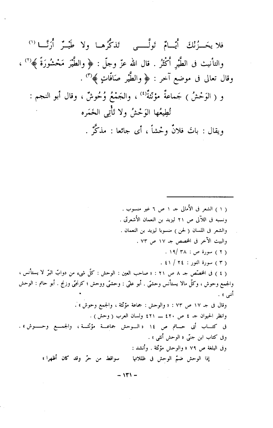 و (الوَحْشُ) جماعةٌ مؤنثةٌ، والجمع وحوشٌ، وقال أبو النجم: