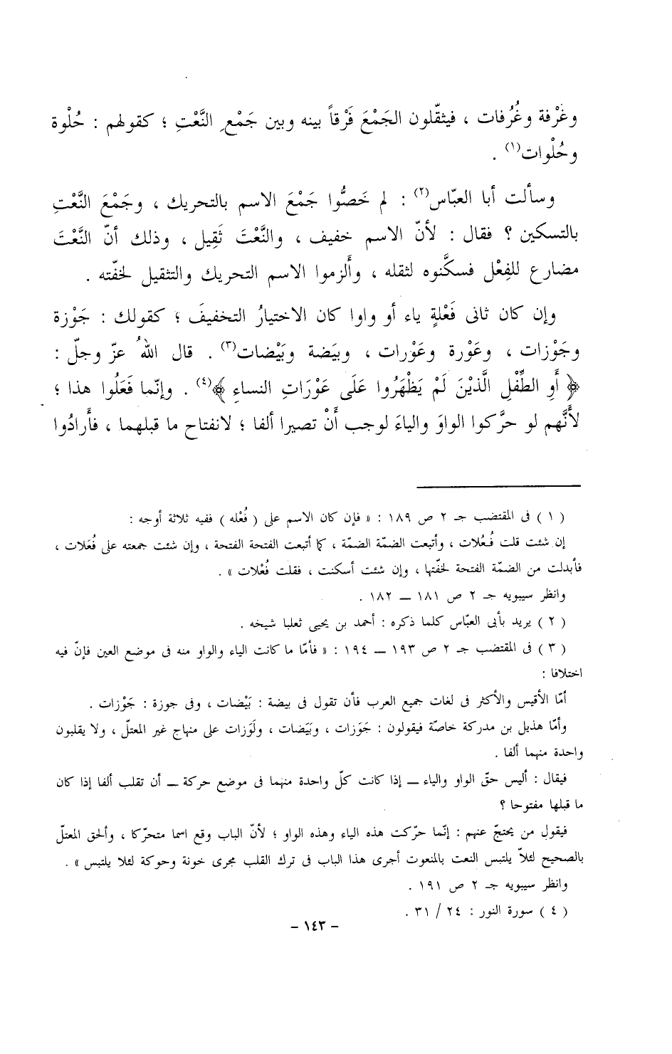 وإن كان ثاني فعلةٍ ياء أو واواً كان الاختيارُ التخفيف؛ كقولك: جَوْزة وجوْزات، وعورة وعورات، وبيضة وبيضات. قال الله عز وجل: (أو الطفل الذين لم يظهروا على عورات النساء). وإنما فعلوا هذا؛ لأنهم لو حركوا الواو والياء لوجب أن تصيرا ألفا؛ لانفتاح ما قبلهما، فأرادُوا