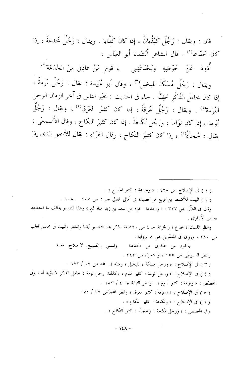 ويقال: رجلٌ مُسَكَةٌ للبخيل، وقال أبو عبيدة: يقال: رجلٌ نومةٌ، إذا كان خامل الذكر خفيهُ. جاء في الحديث: خير الناس في آخر الزمان الرجل النومة. ويقال: رجلٌ عُرقةٌ، إذا كان كثير العرقِ، ويقال: رجُلٌ نُوَمة، إذا كان نواما، ورجل نُكَحةٌ، إذا كان كثير النكاح، وقال الأصمعي: يقال: خُجأةٌ، إذا كان كثير النكاح، وقال الفراء: يقال للأحمق الذي إذا
