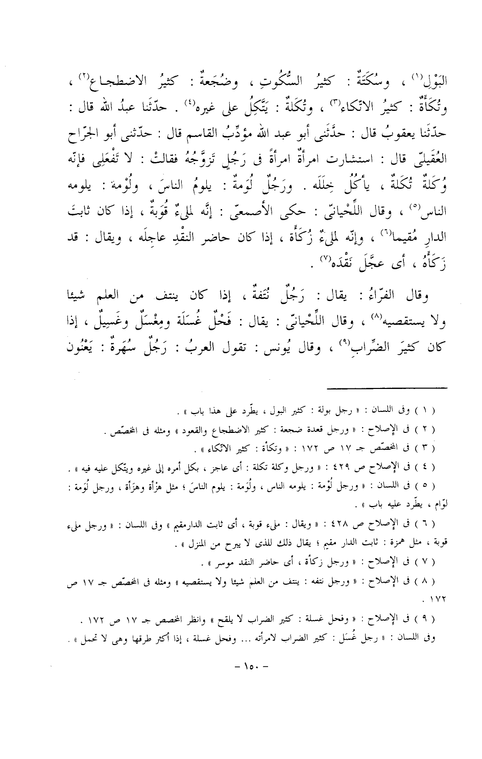 البَوْلِ، وسَكَتَةٌ: كثيرُ السكوتِ، وضَجَعةٌ: كثيرُ الاضطجاع، وتُكَأةٌ: كثيرُ الاتكاء، وتُكَلةٌ: يَتَّكِلُ على غيره. حدثنا عبد الله قال: حدثنا يعقوب قال: حدثني أبو عبد الله مؤدبُ القاسم قال: حدثني أبو الجراح العقيلي قال: استشارت امرأةٌ امرأةً في رجلٍ تزوجه فقالت: لا تفعلي فإنه وُكَلةٌ تُكَلةٌ، يأكل خلله. ورجلٌ لومةٌ: يلوم الناس، ولُوْمة: يلومه الناس، وقال اللحياني: حكى الأصمعي: إنه لمليءٌ قوبةٌ، إذا كان ثابت الدار مقيما، وإنه لمليءٌ زُكأة، إذا كان حاضر النقد عاجله، ويقال: قد زَكَأهُ، أي عجل نقده.