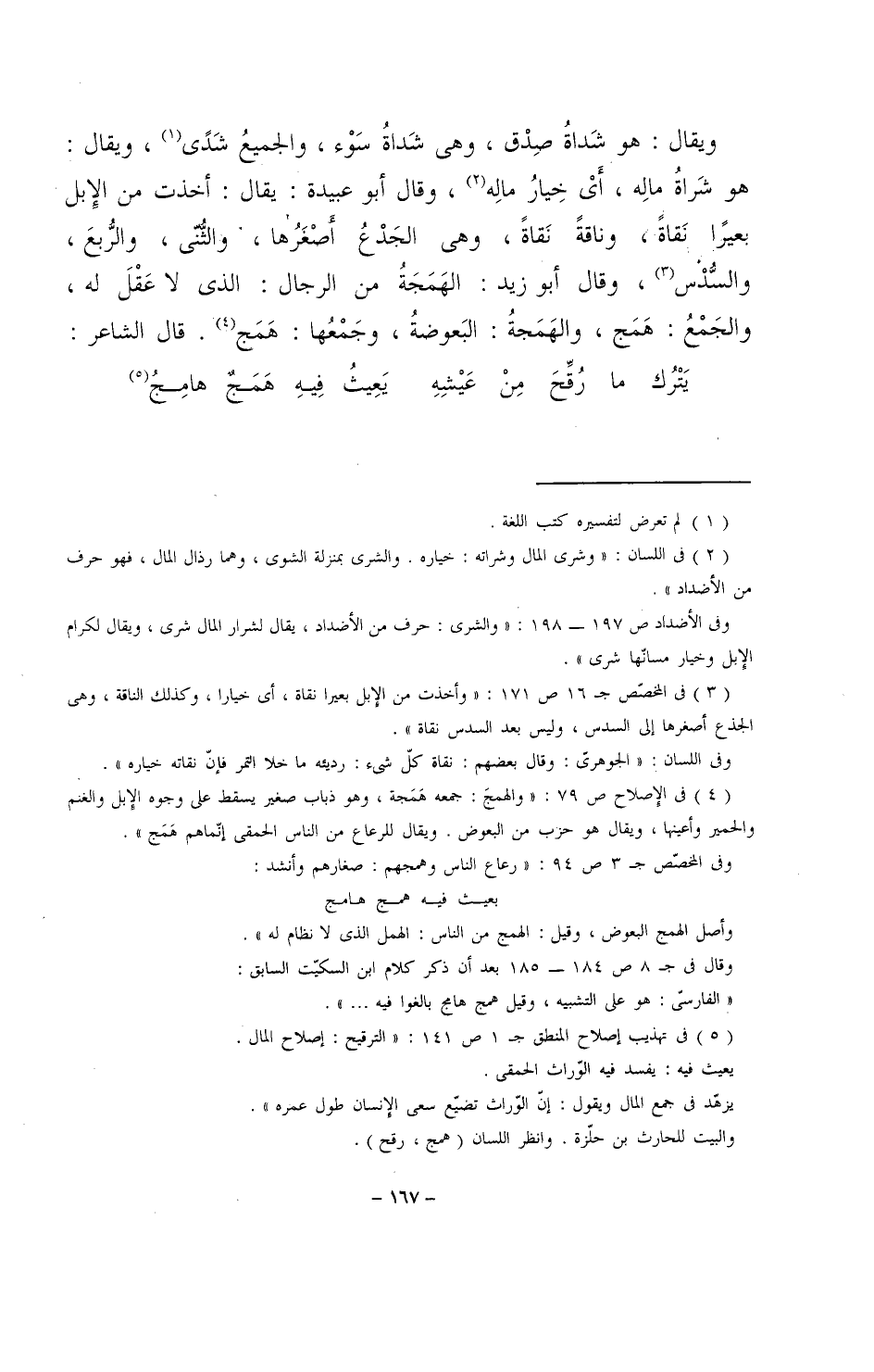 ويقال: هو شداةُ صدق، وهي شداةُ سوء، والجميع شدى، ويقال: هو شراةُ ماله، أيْ خيارُ ماله، وقال أبو عبيدة: يقال: أخذت من الإبل بعيراً نقاةً، وناقةً نقاةً، وهي الجدعُ أصغرها، والثُّنّى، والربع، والسدس، وقال أبو زيد: الهمَجَةُ من الرجال: الذي لا عقل له، والجمع: همج، والهمجةُ: البعوضة، وجمعها: همج. قال الشاعر: