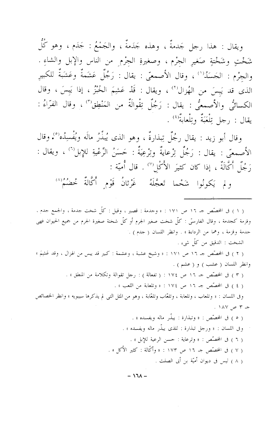 ويقال: هذا رجل جدمةٌ، وهذه جدمةٌ، والجمعُ: جدم، وهو كل شَخْتٍ وشَخْتةٍ صغير الجِرْم، وصغيرةِ الجرمِ من الناس والإبل والشاء. والجِرْم: الجسدُ، وقال الأصمعي: يقال: رجلٌ عشمةٌ وعشبةٌ للكبير الذي قد يبس من الهُزال، ويقال: قَدْ عَشِمَ الخُبْزُ، إذا يبس، وقال الكسائي والأصمعي: يقال: رجلٌ تقوالةٌ من المنطق، وقال الفراء: يقال: رجل تلعبةٌ وتلعابةٌ.