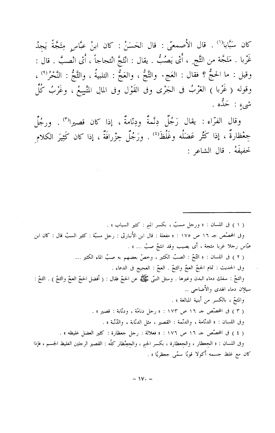 كان سَبَّابا. قال الأصمعي: قال الحسنُ: كان ابن عباس مثَجَّةً يجدُ غربا. مثجة من الثجِ، أيْ يصُبُّ. يقال: انْثَجَّ انثجاجاً، أيْ انصب. قال: وقيل: ما الحجُّ؟ فقال: العج. والثجُّ، والعجُّ: التلبية، والثَّجُّ: النحْرُ، وقوله (غرْبا) الغَرْبُ في الجَرْي وفي القول وفي المال المتَّبيعُ، وغرْبُ كل شيءٍ: حدُّه.