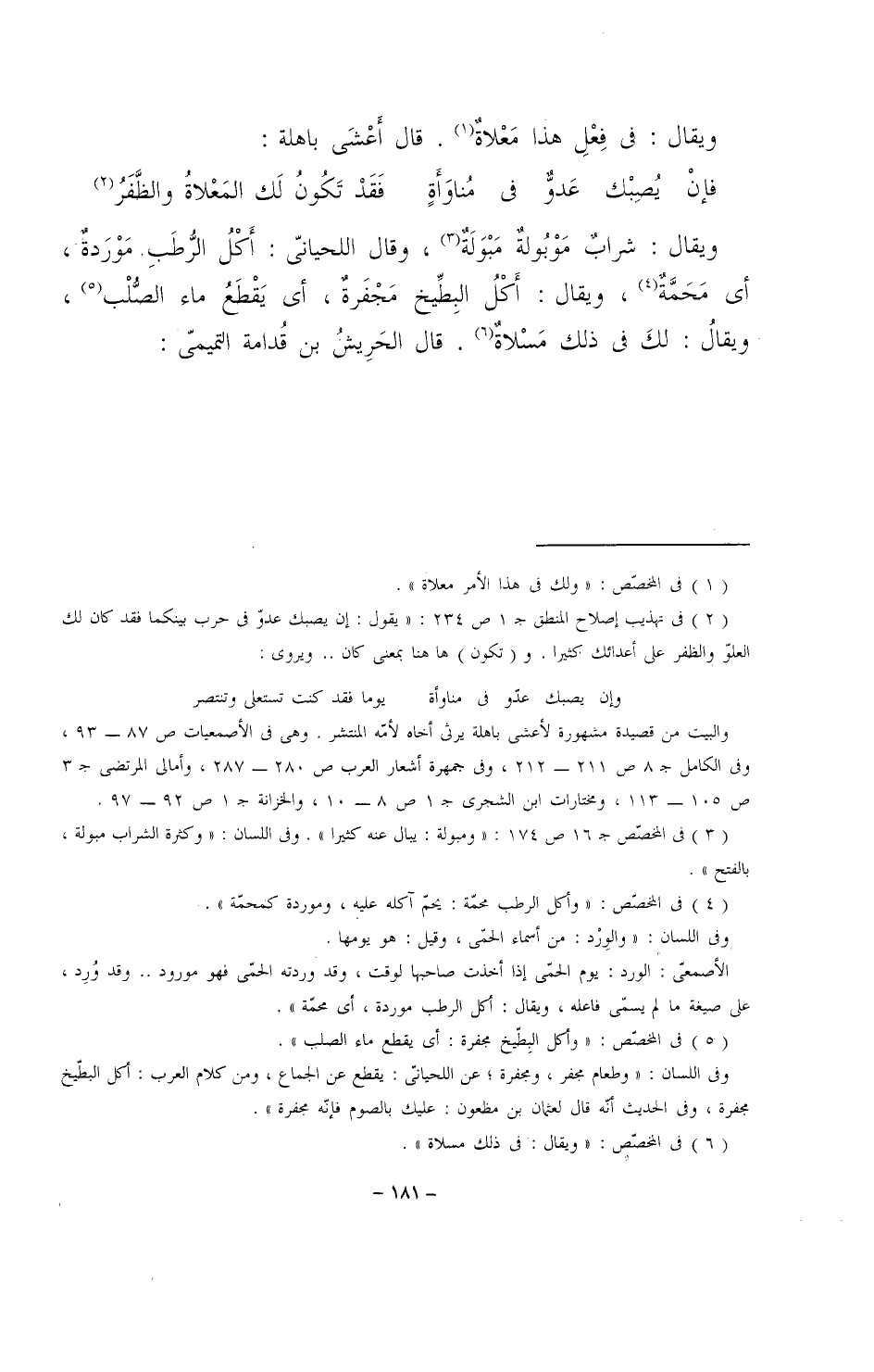 ويقال: شرابٌ موبولةٌ مبْوَلَةٌ، وقال اللحياني: أكلُ الرطبِ موْرَدةٌ، أي محمَّةٌ، ويقال: أكْلُ البطيخ مجفَرةٌ، أي يقطع ماء الصُّلْب، ويقال: لك في ذلك مسلاةٌ، قال الحريشُ بن قدامة التميمي: