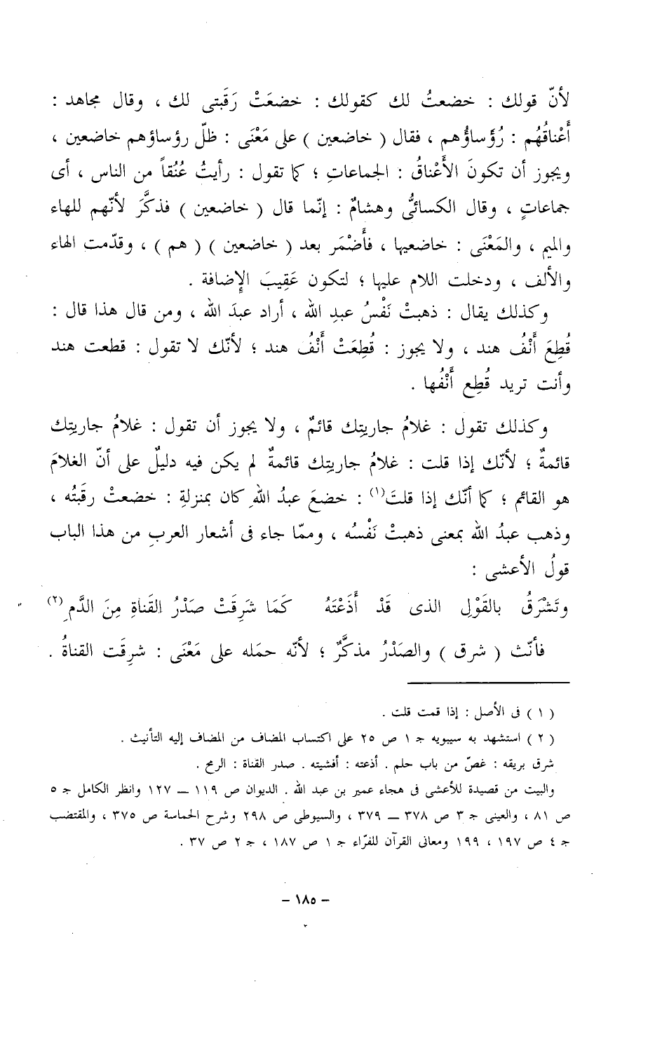 وكذلك تقول: غلامُ جاريتك قائمٌ، ولا يجوز أن تقول: غلامُ جاريتك قائمةٌ؛ لأنك إذا قلت: غلامُ جاريتك قائمةٌ لم يكن فيه دليلٌ على أن الغلام هو القائم؛ كما أنك إذا قلت: خضع عبد الله كان بمنزلة: خضعتْ رقبتُه، وذهب عبد الله بمعنى ذهبت نفسه، ومما جاء في أشعار العربِ من هذا الباب قول الأعشى: