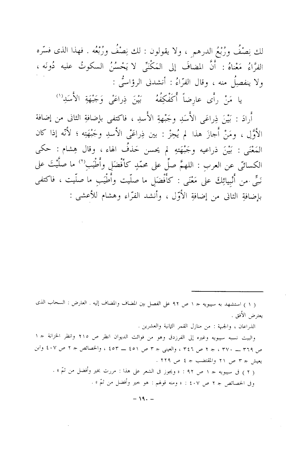 أراد: بين ذراعي السد وجبهة الأسد، فاكتفى بإضافة الثاني من إضافة الأول، ومن أجاز هذا لم يُجِزْ: بين ذراعي الأسد وجبهته؛ لأنه إذا كان المعنى: بين ذراعيه وجبهته لم يحسن حذفُ الهاء، وقال هشام: حكى الكسائي عن العرب: اللهم صل على محمدٍ كأفضل وأطيب ما صليت على نبي من أنبيائك على معنى: كأفضل ما صليت وأطيب ما صليت، فاكتفى بإضافة الثاني من إضافة الأول، وأنشد الفراء وهشام للأعشى: