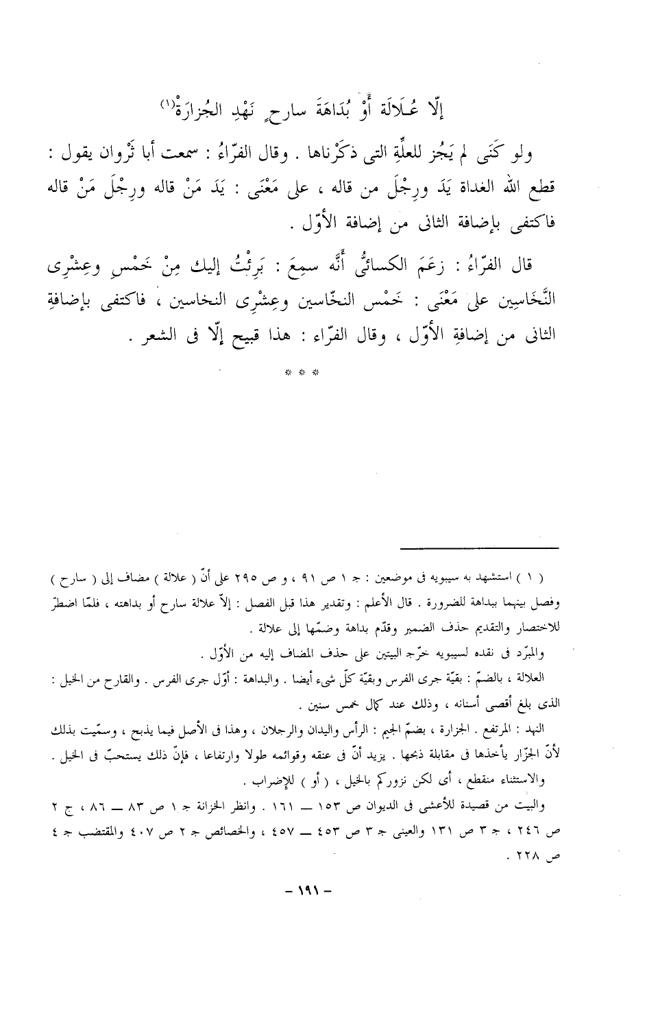 قال الفراء: زعم الكسائي أنه سمع: برئتُ إليك من خمس وعشري النخاسين على معنى: خمس النخاسين وعشري النخاسين، فاكتفى بإضافة الثاني من إضافة الأول، وقال الفراء: هذا قبيح إلا في الشعر.