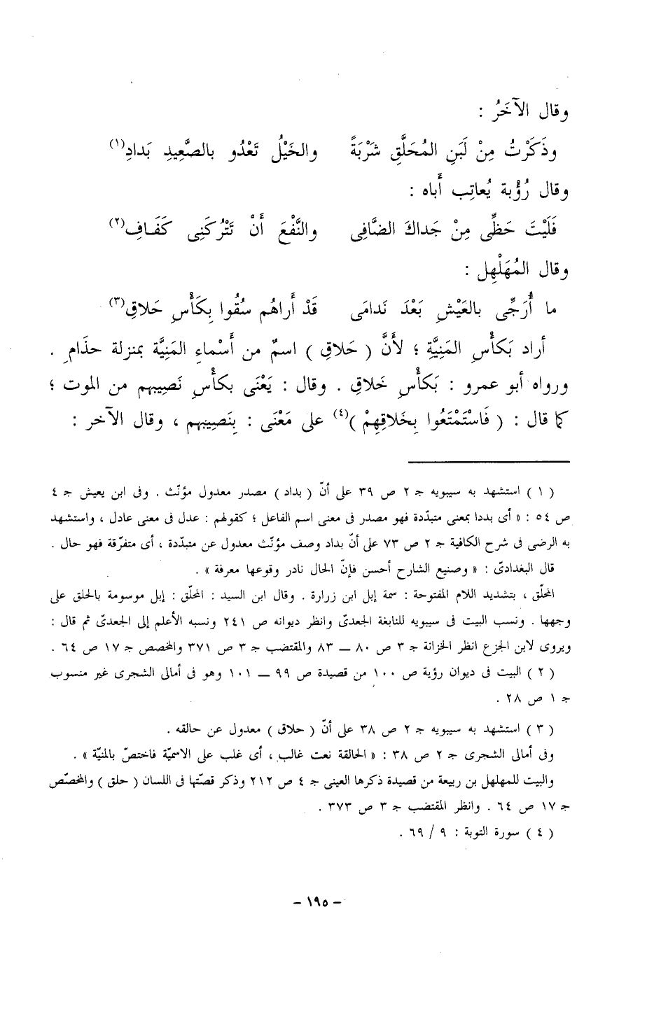 أراد بكأس المنية؛ لأن (حَلاقِ) اسمٌ من أسماء المنية بمنزلة حذام. ورواه أبو عمرو: بكأسِ خلاقِ. وقال: يعني بكأس نصيبهم من الموت؛ كما قال: (فاستمتعوا بخلاقهم) على معنى: بنصيبهم، وقال الآخر: