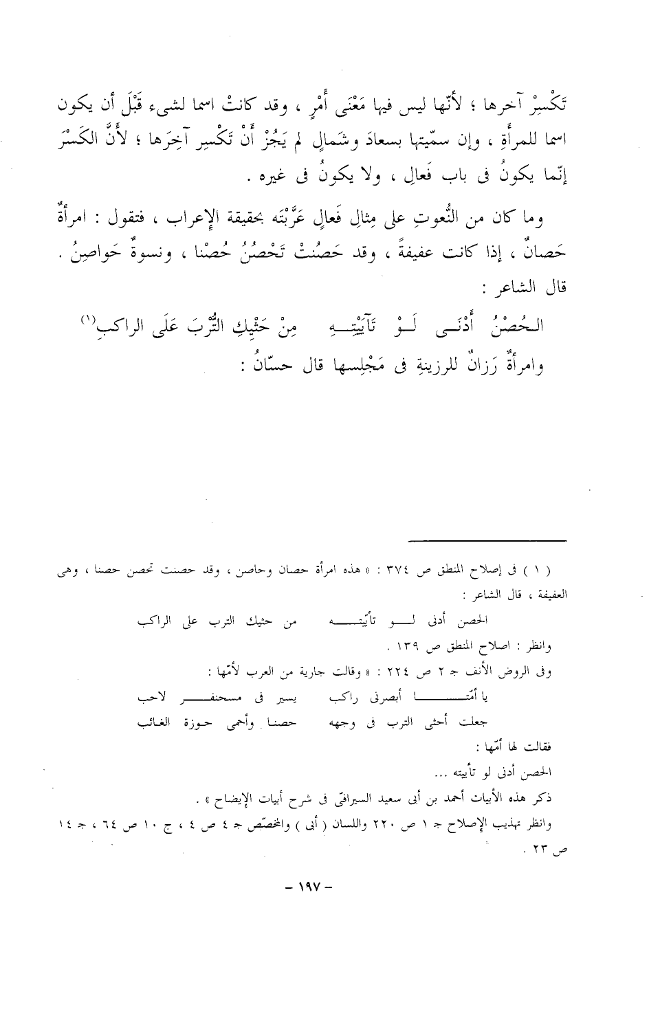 وما كان من النعوت على مثال فعالٍ عربته بحقيقة الإعراب، فتقول: امرأةٌ حصانٌ، إذا كانت عفيفةً، وقد حصُنتْ تحصُنُ حُصْنا، ونسوةٌ حواصِنُ. قال الشاعر: