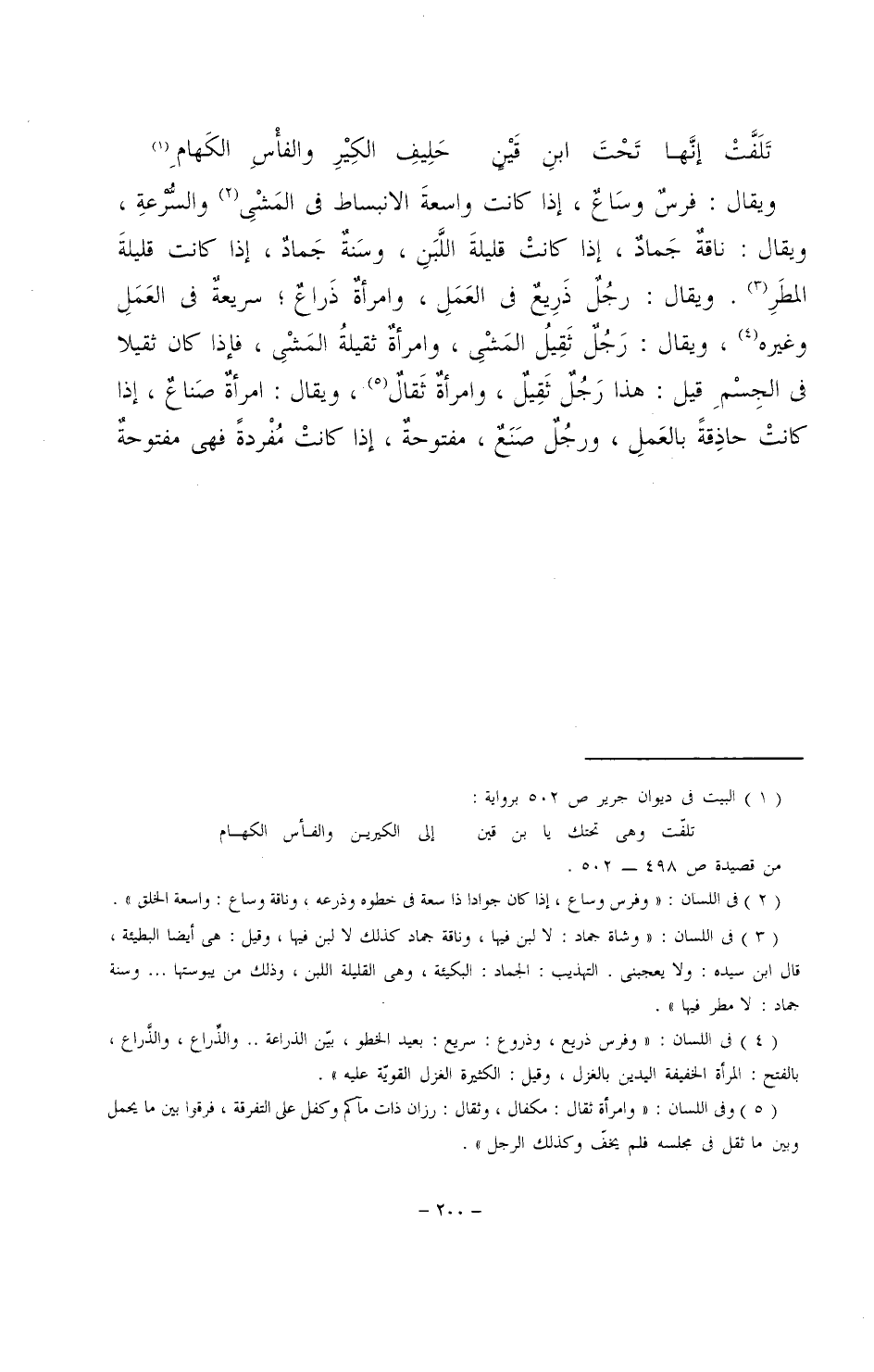 ويقال: فرسٌ وساعٌ، إذا كانت واسعة الانبساط في المشي والسرعة، ويقال: ناقةٌ جمادٌ، إذا كانت قليلة اللبن، وسنةٌ جمادٌ، إذا كانت قليلة المطر. ويقال: رجلٌ ذريعٌ في العمل، وامرأةٌ ذراعٌ؛ سريعةٌ في العمل وغيره، ويقال: رجلٌ ثقيلُ المشي، وامرأةٌ ثقيلةُ المشي، فإذا كان ثقيلاً في الجسم قيل: هذا رجلٌ ثقيلٌ، وامرأةٌ ثقالٌ، ويقال: امرأةٌ صناعٌ، إذا كانت حاذقةً بالعمل، ورجلٌ صنعٌ، مفتوحةٌ، إذا كانت مفردةً فهي مفتوحةٌ