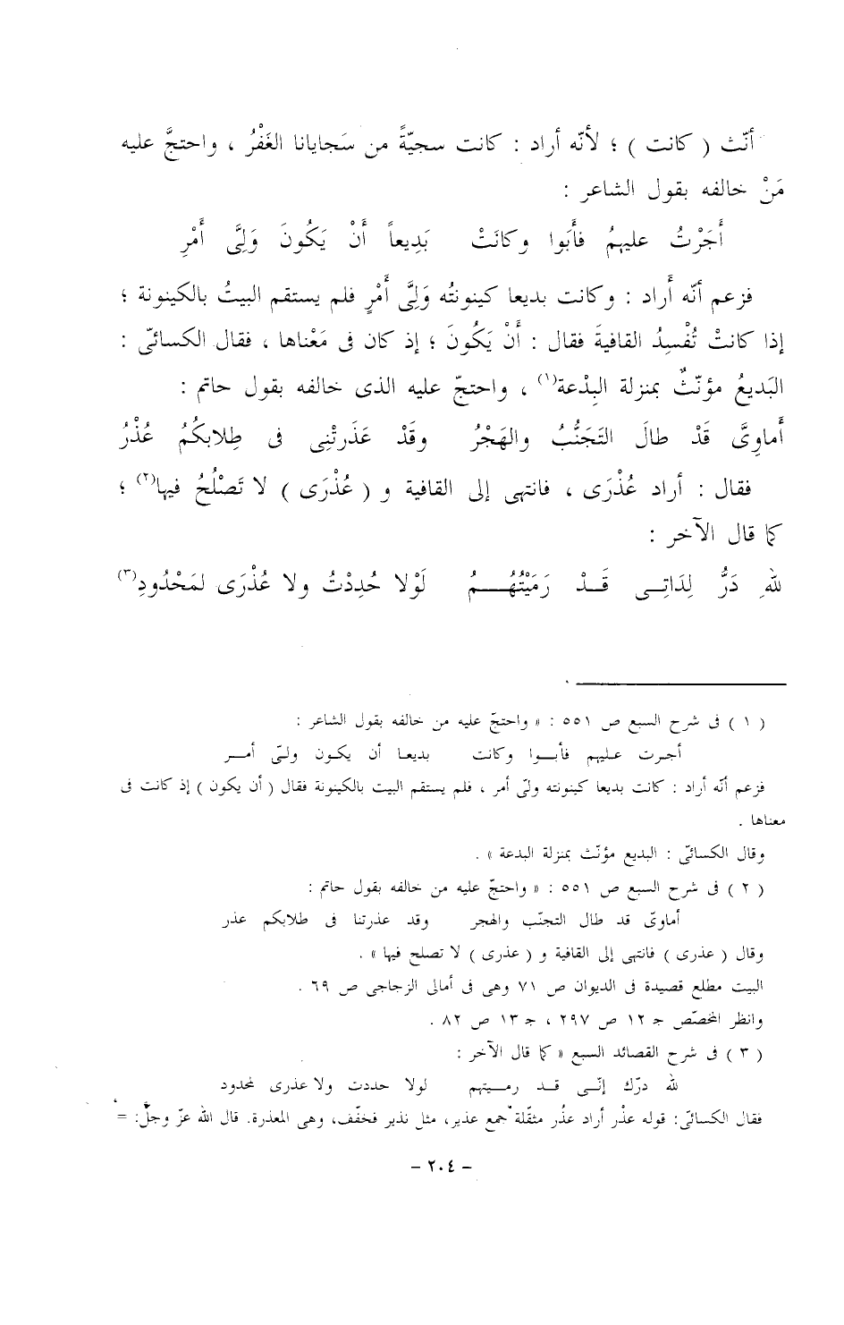 فزعم أنه أراد: وكانت بديعاً كينونته ولي أمرٍ فلم يستقم البيتُ بالكينونة؛ إذا كانت تفسد القافية فقال: أن يكون؛ إذ كان في معناها، فقال الكسائي: البديع مؤنث بمنزلة البدعة، واحتج عليه الذي خالفه بقول حاتم:.