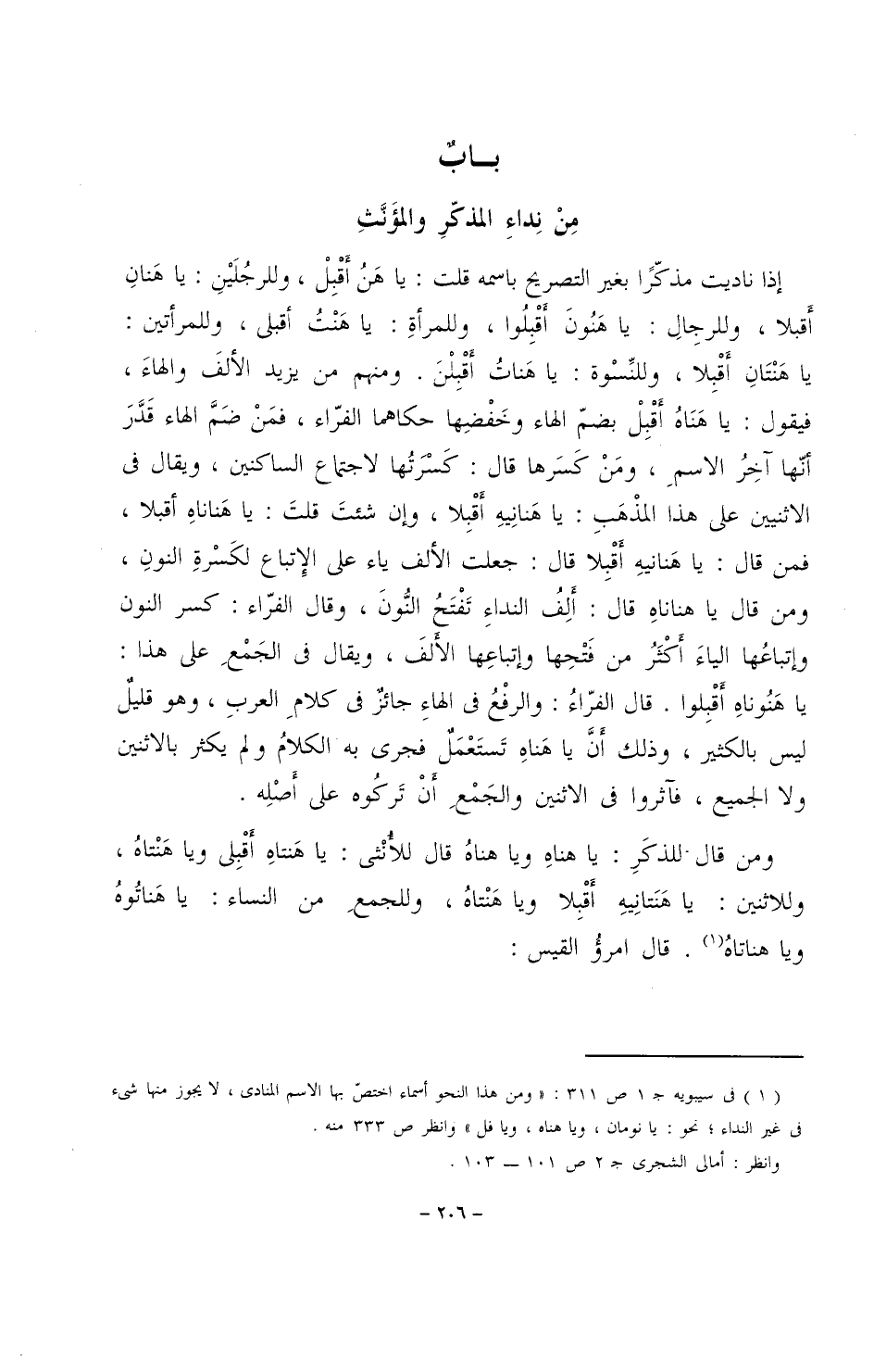 ومن قال للذكر: يا هناه ويا هناهُ قال للأنثى: يا هنتاه أقبلي ويا هنتاه، وللاثنين: يا هنتانيه أقبلا ويا هنتاه، وللجمع من النساء: يا هناتوه ويا هناتاه، قال امرؤ القيس: