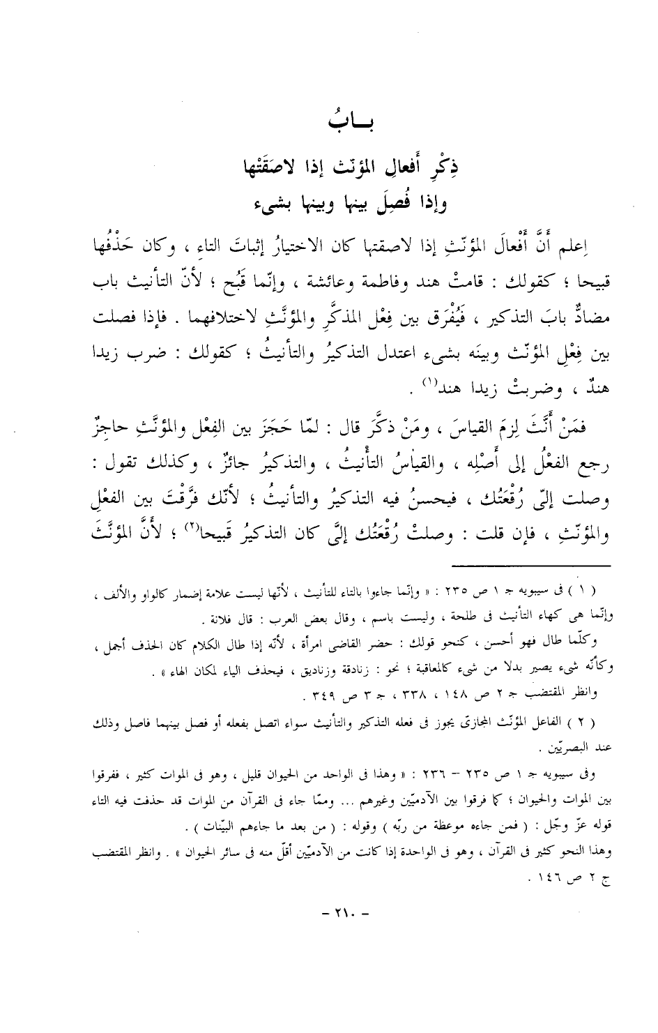 اعلم أن أفعال المؤنثِ إذا لاصقتها كان الاختيارُ إثبات التاء، وكان حذفها قبيحا؛ كقولك: قامتْ هند وفاطمة وعائشة، وإنما قَبُح؛ لأن التأنيث باب مضاد باب التذكير، فيفرق بين فعل المذكر والمؤنث لاختلافهما. فإذا فصلت بين فعل المؤنث وبينه بشيء اعتدل التذكير والتأنيث؛ كقولك: ضرب زيداً هندٌ، وضربت زيداً هند.