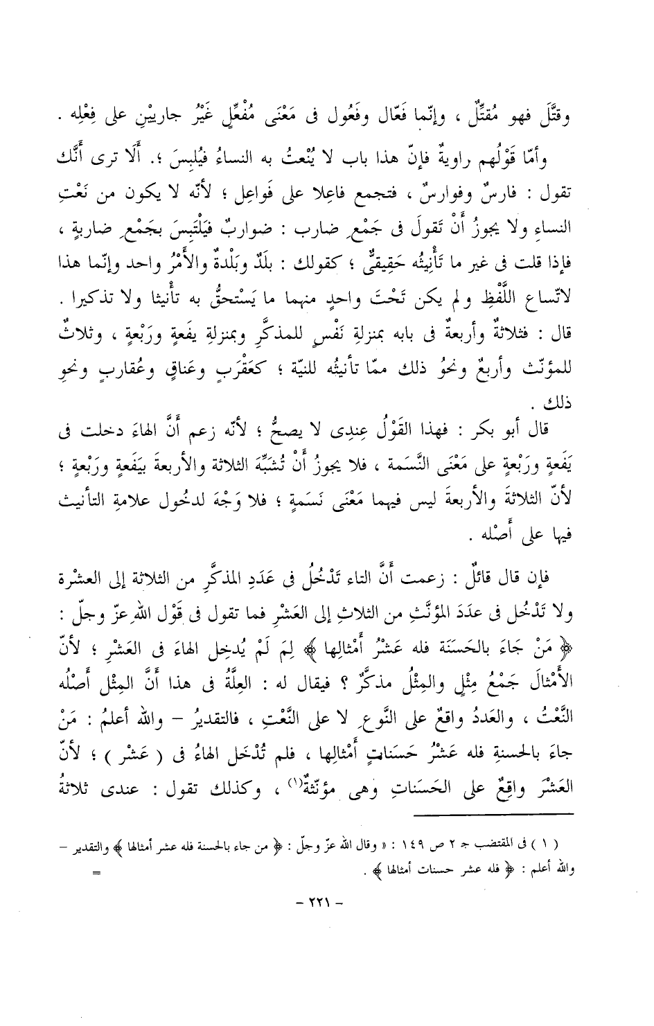 فإن قال قائلٌ: زعمت أن التاء تدخُلُ في عدد المذكر من الثلاثة إلى العشرة ولا تدخل في عدد المؤنث من الثلاث إلى العشر فما تقول في قول الله عز وجل: (من جاء بالحسنة فله عشر أمثالها) لِمَ لَمْ يُدخِل الهاء في العشر؛ لأن الأمثال جمع مثل والمِثْلُ مذكر؟ فيقال له: العلة في هذا أن المثل أصله النعت، والعدد واقعٌ على النوع لا على النعت، فالتقدير - والله أعلم: مَنْ جاء بالحسنة فله عشر حسناتٍ أمثالها، فلم تُدْخَل الهاء في (عَشْر)؛ لأن العشر واقعٌ على الحسنات وهي مؤنثةٌ، وكذلك تقول: عندي ثلاثةُ
