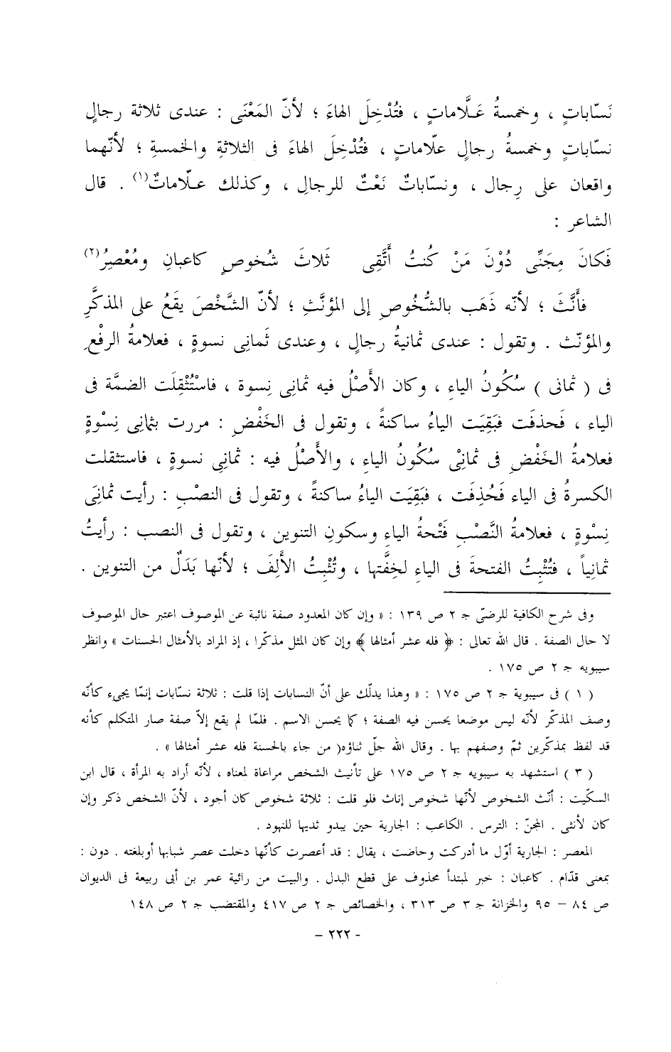 نساباتٍ، وخمسةُ علاماتٍ، فتُدْخِلَ الهاء؛ لأن المعنى: عندي ثلاثة رجالٍ نساباتٍ وخمسةُ رجالٍ علاماتٍ، فتُدْخِلَ الهاء في الثلاثة والخمسةِ؛ لأنهما واقعان على رجال، ونساباتٌ نعتٌ للرجال، وكذلك علاماتٌ. قال الشاعر: