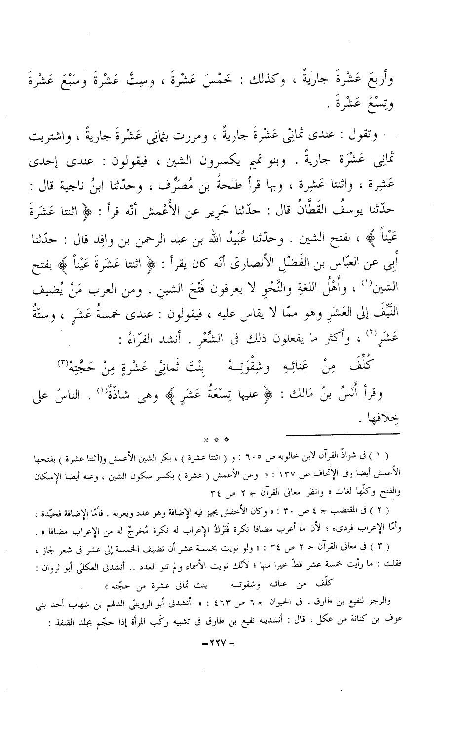 وتقول: عندي ثماني عشرة جاريةً، ومررت بثماني عشرة جاريةً، واشتريت ثماني عشرة جاريةً. وبنو تميم يكسرون الشين، فيقولون: عندي إحدى عشرة، واثنتا عشرة، وبها قرأ طلحة بن مصرف، وحدثنا ابن ناجية قال: حدثنا يوسف القطان قال: حدثنا جرير عن الأعمش أنه قرأ: (اثنتا عشرة عيناً)، بفتح الشين. وحدثنا عبيد الله بن عبد الرحمن بن وافد قال: حدثنا أبي عن العباس بن الفضل الأنصاري أنه كان يقرأ: (اثنتا عشرة عيناً) بفتح الشين، وأهلُ اللغة والنحو لا يعرفون فتح الشين. ومن العرب من يُضيف النيف إلى العشر وهو مما لا يقاس عليه، فيقولون: عندي خمسة عشر، وستةُ عشر، وأكثر ما يفعلون ذلك في الشعر. أنشد الفراء:
