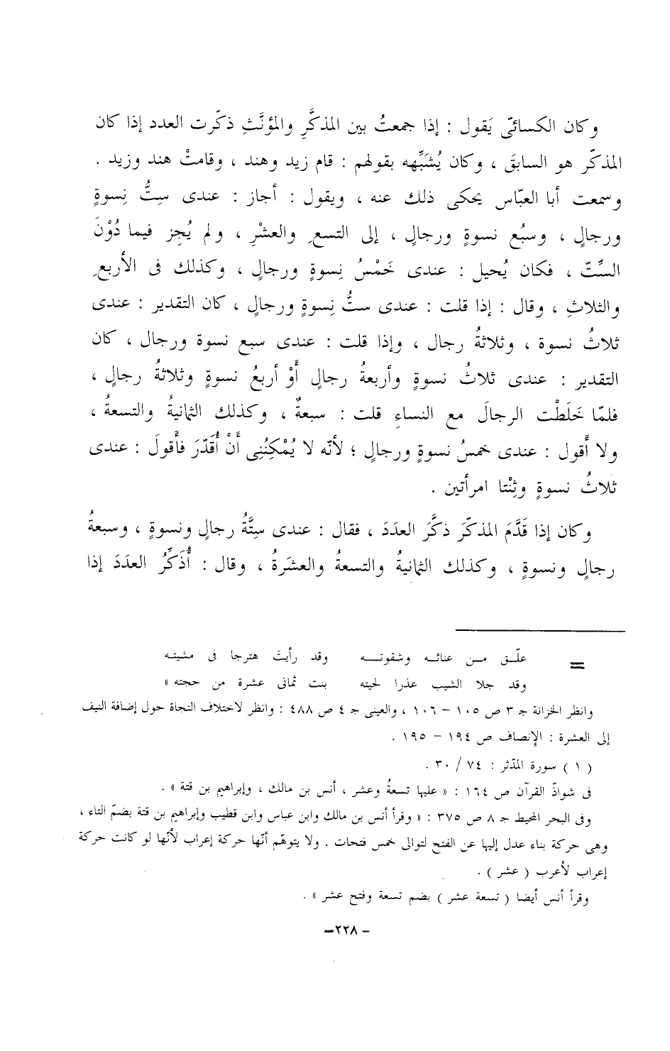 وكان الكسائي يقول: إذا جمعتُ بين المذكر والمؤنث ذكرت العدد إذا كان المذكر هو السابق، وكان يشبهه بقولهم: قام زيد وهند، وقامت هند وزيد. وسمعت أبا العباس يحكي ذلك عنه، ويقول: أجاز: عندي ستُّ نسوةٍ ورجالٍ، وسبع نسوة ورجال، إلى التسع والعشر، ولم يجز فيما دون الست، فكان يحيل: عندي خمس نسوة ورجال، وكذلك في الأربع والثلاث، وقال: إذا قلت: عندي ست نسوة ورجال، كان التقدير: عندي ثلاث نسوة، وثلاثة رجال، وإذا قلت: عندي سبع نسوة ورجال، كان التقدير: عندي ثلاث نسوةٍ وأربعةُ رجالٍ أو أربع نسوةٍ وثلاثةُ رجال، فلما خلطت الرجال مع النساء قلت: سبعةٌ، وكذلك الثمانية والتسعة، ولا أقول: عندي خمس نسوة ورجال؛ لأنه لا يمكنني أن أقدر فأقول: عندي ثلاث نسوة وثنتا امرأتين.