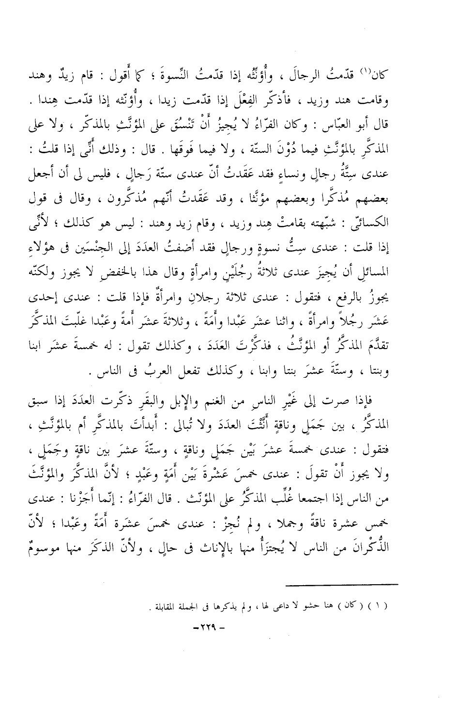 فإذا صرت إلى غير الناس من الغنم والإبل والبقر ذكرت العدد إذا سبق المذكر، بين جملٍ وناقةٍ أنثت العدد ولا تُبالي: أبدأت بالمذكر أم بالمؤنث، فتقول: عندي خمسة عشر بين جملٍ وناقةٍ، وستة عشر بين ناقةٍ وجمل، ٍ ولا يجوز أنْ تقول: عندي خمس عشرة بين أمةٍ وعبدٍ؛ لأن المذكر والمؤنث من الناس إذا اجتمعا غُلب المذكر على المؤنث. قال الفراء: إنما أجزنا: عندي خمس عشرة ناقةً وجملا، ولم نُجِزْ: عندي خمس عشرة أمةً وعبدا؛ لأن الذُّكران من الناس لا يُجتزأ منها بالإناث في حالٍ، ولأن الذكر منها موسومٌ