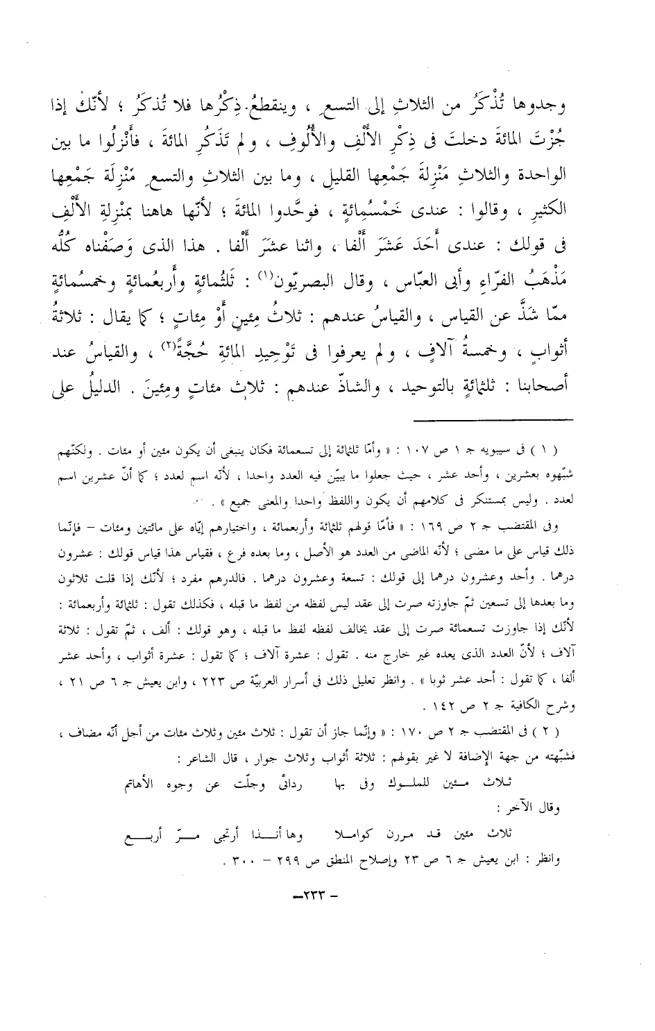 وجدوها تُذكرُ من الثلاث إلى التسع، وينقطعُ ذكرها فلا تُذكرُ؛ لأنك إذا جُزتَ المائة دخلت في ذكر الألف والألوف، ولم تذكر المائة، فأنزلوا ما بين الواحدة والثلاث منزلة جمعها القليل، وما بين الثلاث والتسع منزلة جمعها الكثير، وقالوا: عندي خمسمائةٍ، فوحدوا المائة؛ لأنها هاهنا بمنزلة الألف في قولك: عندي أحد عشر ألفا، واثنا عشر ألفاً. هذا الذي وصفناه كله مذهب الفراء وأبي العباس، وقال البصريون: ثلثمائةٍ وأربعمائةٍ وخمسمائةٍ مما شذ عن القياس، والقياسُ عندهم: ثلاثُ مئين أو مئاتٍ؛ كما يقال: ثلاثة أثواب، وخمسةُ آلافٍ، ولم يعرفوا في توحيد المائة حجةً، والقياسً عند أصحابنا: ثلاثمائةٍ بالتوحيد، والشاذ عندهم: ثلاث مئاتٍ ومئين. الدليلُ على