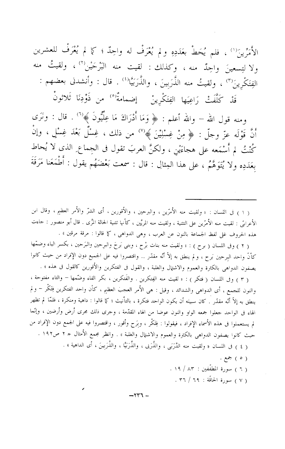الأمرين، فلم يُحطْ بعدده ولم يعرف له واحدٌ؛ كما لم يعرفْ للعشرين ولا لتسعين واحدٌ منه، وكذلك: لقيت منه البرحين، ولقيتُ منه الفتكرين، ولقيتُ منه الذربين، والذربيا. قال: وأنشدني بعضهم: