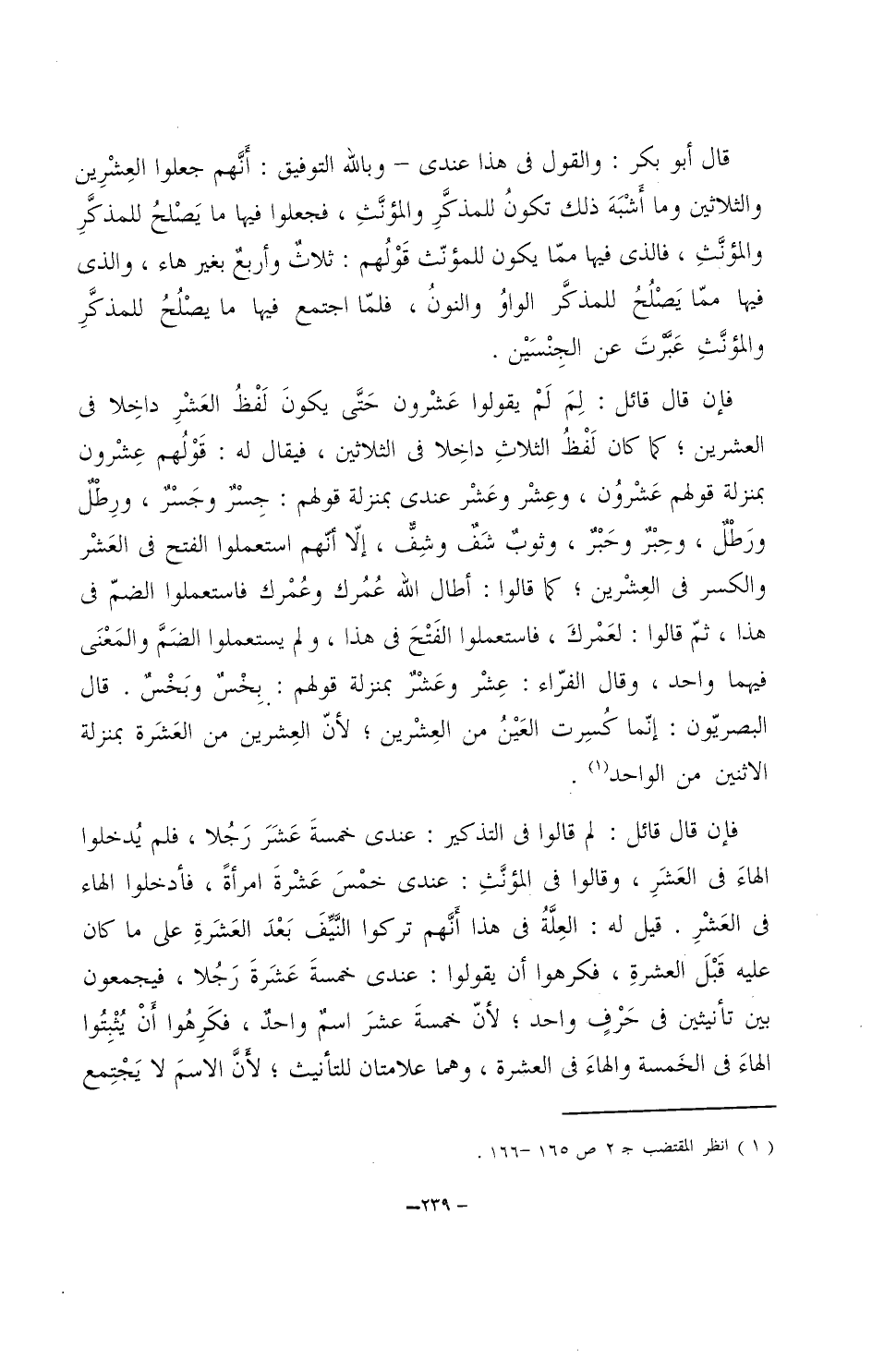 قال أبو بكر: والقول في هذا عندي- وبالله التوفيق: أنهم جعلوا العشرين والثلاثين وما أشبه ذلك تكون للمذكر والمؤنث، فجعلوا فيها ما يصلح للمذكر والمؤنث، فالذي فيها مما يكون للمؤنث قولهم: ثلاث وأربع بغير هاء، والذي فيها مما يصلح للمذكر الواو والنون، فلما اجتمع فيها ما يصلح للمذكر والمؤنث عبرت عن الجنسين.