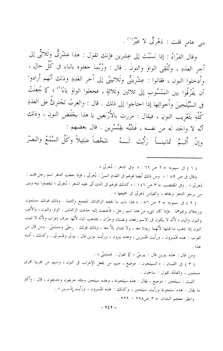 وقال الفراء: إذا نسبت إلى عشرين فإنك تقول: هذا عشري وثلاثي إلى آخر العدد، وتُلقى الواو والنون. قال: وربما جعلوه بالياء في كل حال، وأدخلوا النون، فقالوا: عشريني وثلاثيني إلى آخر العدد وذلك أنهم أرادوا أن يفرقوا بين المنسوب إلى ثلاثين وثلاثةٍ، فجعلوا الواو ياء، كما جُعِلَتْ في السيلحين وأخواتها إذا احتاجوا إلى ذلك. قال: والعرب تجتريء على العدد كله بتعريب النون، فيقال: مررت بالأربعين يا هذا بخفض النون، وذلك أنه لا واحد له من نفسه، فشبه بقنسرين. قال بعضهم:
