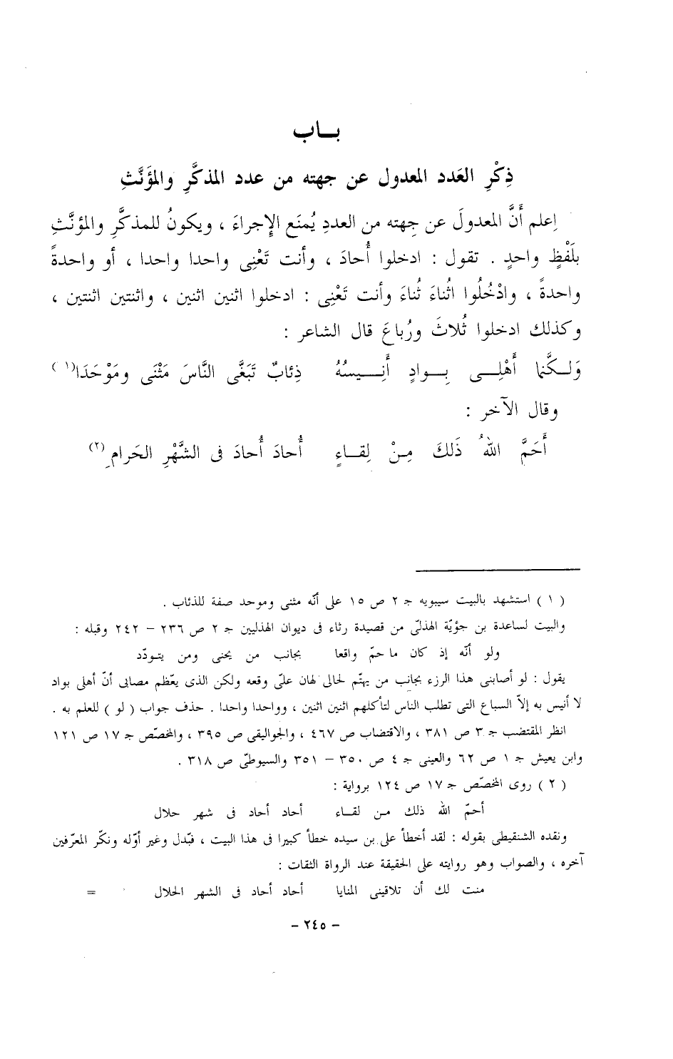 اعلم أن المعدول عن جهته من العدد يمنع الإجراء، ويكون للمذكر والمؤنث بلفظٍ واحدٍ. تقول: ادخلوا أحاد، وأنت تعني واحدًا واحدًا، أو واحدةً واحدةً، وادخلوا اثناء ثناء وأنت تعني: ادخلوا اثنين اثنين، واثنتين اثنتين، وكذلك ادخلوا ثلاث ورباع قال الشاعر: