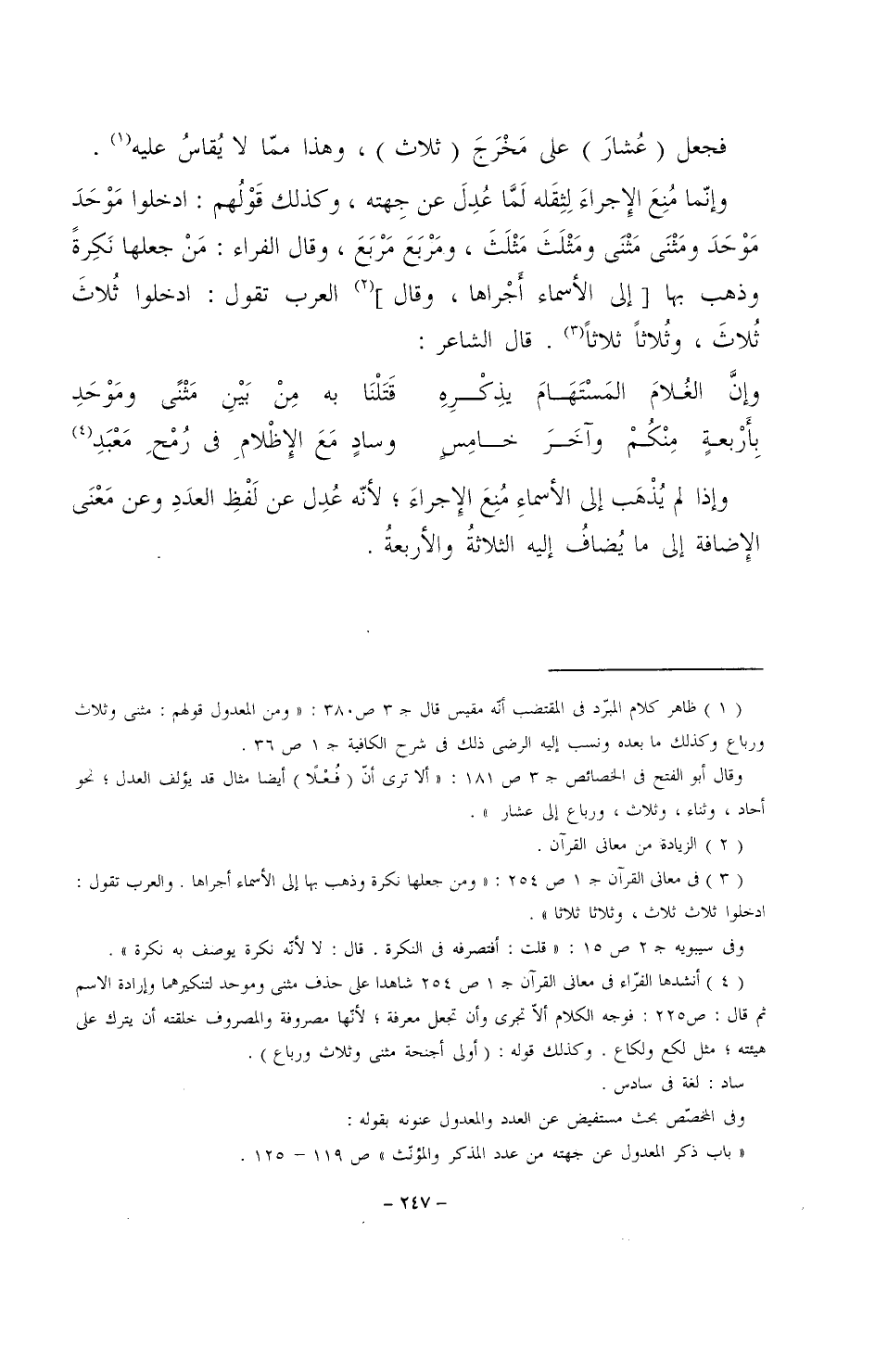 وإنما منع الإجراء لثقله لما عدل عن جهته، وكذلك قولهم: ادخلوا موحد موحد ومثنى مثنى ومثلث مثلث، ومربع مربع، وقال الفراء: من جعلها نكرةً وذهب بها [إلى السماء أجراها، وقال] العرب تقول: ادخلوا ثلاث ثلاث، وثلاثًا ثلاثًا. قال الشاعر: