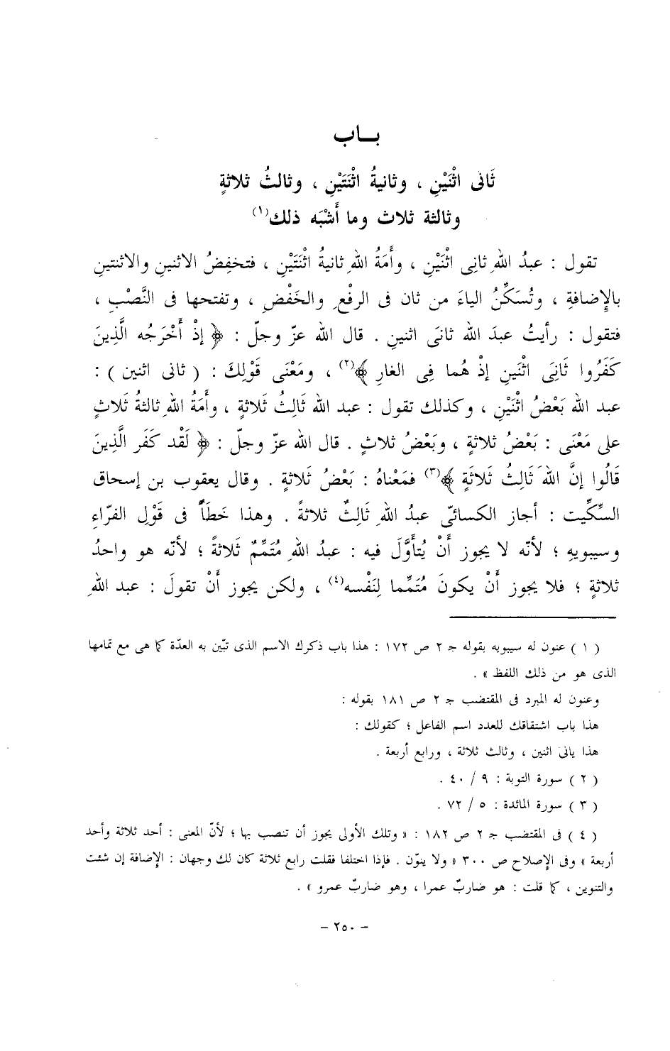 تقول: عبد الله ثاني اثنين، وأمة الله ثانية اثنتين، فتخفض الاثنين والاثنتين بالإضافة، وتسكن الياء من ثان في الرفع والخفض، وتفتحها في النصب، فتقول: رأيت عبد الله ثاني اثنين. قال الله عز وجل: (إذ أخرجه الذين كفروا ثاني اثنين إذ هما في الغار)، ومعنى قولك: (ثاني اثنين): عبد الله بعض اثنين، وكذلك تقول: عبد الله ثالث ثلاثةٍ، وأمة الله ثالثة ثلاثٍ على معنى: بعض ثلاثةٍ، وبعض ثلاثٍ. قال الله عز وجل: (لقد كفر الذين قالوا إن الله ثالث ثلاثةٍ) فمعناه: بعض ثلاثةٍ. وقال يعقوب بن إسحاق السكيت: أجاز الكسائي عبد الله ثالث ثلاثةً. وهذا خطأ في قول الفراء وسيبويه؛ لأنه لا يجوز أن يتأول فيه: عبد الله متمم ثلاثةً؛ لأنه هو واحد ثلاثةٍ؛ فلا يجوز أن يكون متمما لنفسه، ولكن يجوز أن تقول: عبد الله