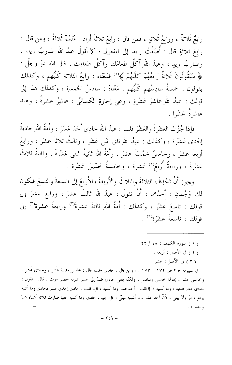 ويجوز أن تحذف الثلاثة والثلاث والأربعة والأربع إلى التسعة والتسع فيكون لك وجهان: أحدهما: أن تقول: عبد الله ثالث عشر، ورابع عشر إلى قولك: تاسع عشر، وكذلك: أمة الله ثالثة عشرة ورابعة عشرة إلى قولك: تاسعة عشرة.