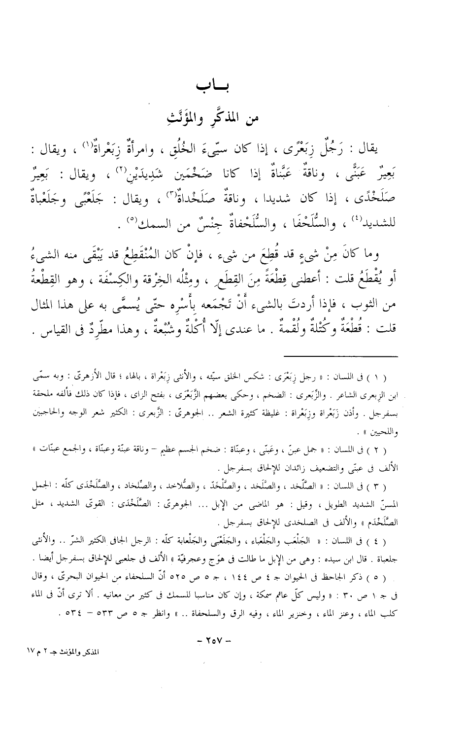 يقال: رجل زبعري، إذا كان سيء الخلق، وامرأة زبعراة، ويقال: بعير عبنى، وناقة عبناة إذا كانا ضخمين شديدين، ويقال: بعير صلخدي، إذا كان شديدًا، وناقة صلخداة، ويقال: جلعبي وجلعباة للشديد، والسلحفا، والسلحفاة جنس من السمك.