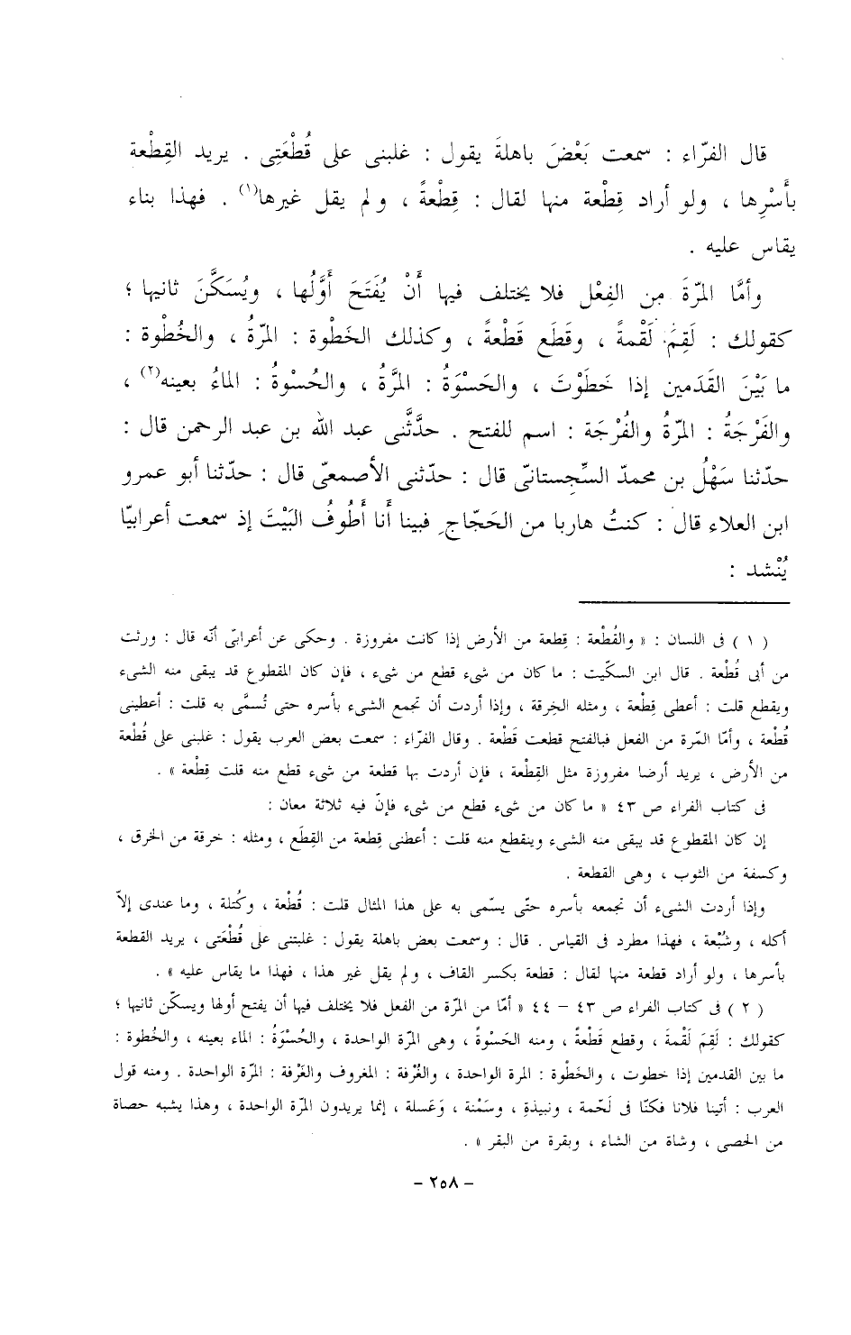 وأما المرة من الفعل فلا يختلف فيها أن يفتح أولها، ويسكن ثانيها؛ كقولك: لقم: لقمة، وقطع قطعة، وكذلك الخطوة: المرة، والخطوة: ما بين القدمين إذا خطوت، والحسوة: المرة، والحسوة: الماء بعينه، والفرجة: المرة والفرجة: اسم للفتح. حدثني عبد الله بن عبد الرحمن قال: حدثنا سهل بن محمد السجستاني قال: حدثني الأصمعي قال: حدثنا أبو عمرو ابن العلاء قال: كنت هاربا من الحجاج فبينا أنا أطوف البيت إذ سمعت أعرابيًا ينشد: