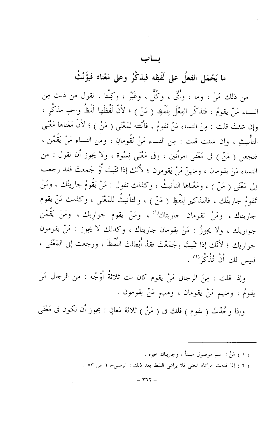 من ذلك من، وما، وأي، وكل، وغير، وكلتا. تقول من ذلك من النساء من يقوم، فتذكر الفعل للفظ (من)؛ لأن لفظها لفظ واحدٍ مذكر، وإن شئت قلت: من النساء من تقوم، فأنثته لمعنى (من)؛ لأن معناها معنى التأنيث، وإن شئت قلت: من النساء من تقومان، ومن النساء من يقمن، فتجعل (من) في معنى امرأتين، وفي معنى نسوة، ولا يجوز أن تقول: من النساء من يقومان، ومنهن من يقومون؛ لأنك إذا ثنيت أو جمعت فقد رجعت إلى معنى (من)، ومعناها التأنيث، وكذلك تقول: من يقوم جاريتك، ومن تقوم جاريتك، فالتذكير للفظ (من)، والتأنيث للمعنى، وكذلك من يقوم جاريتاك، ومن تقومان جاريتاك، ومن يقوم جواريك، ومن يقمن جواريك، ولا يجوز: من يقومان جاريتاك، وكذلك لا يجوز: من يقومون جواريك؛ لأنك إذا ثنيت وجمعت فقد أبطلت اللفظ، ورجعت إلى المعنى، فليس لك أن تذكر.