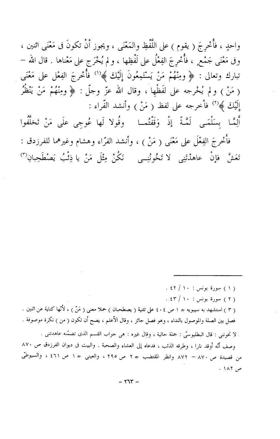 واحدٍ، فأخرج (يقوم) على اللفظ والمعنى، ويجوز أن تكون في معنى اثنين، وفي معنى جمعٍ، فأخرج الفعل على لفظها، ولم يخرج على معناها. قال الله -تبارك وتعالى-: (ومنهم من يستمعون إليك) فأخرج الفعل على معنى (من) ولم يخرجه على لفظها، وقال الله عز وجل: (ومنهم من ينظر إليك) فأخرجه على لفظ (من) وأنشد الفراء: