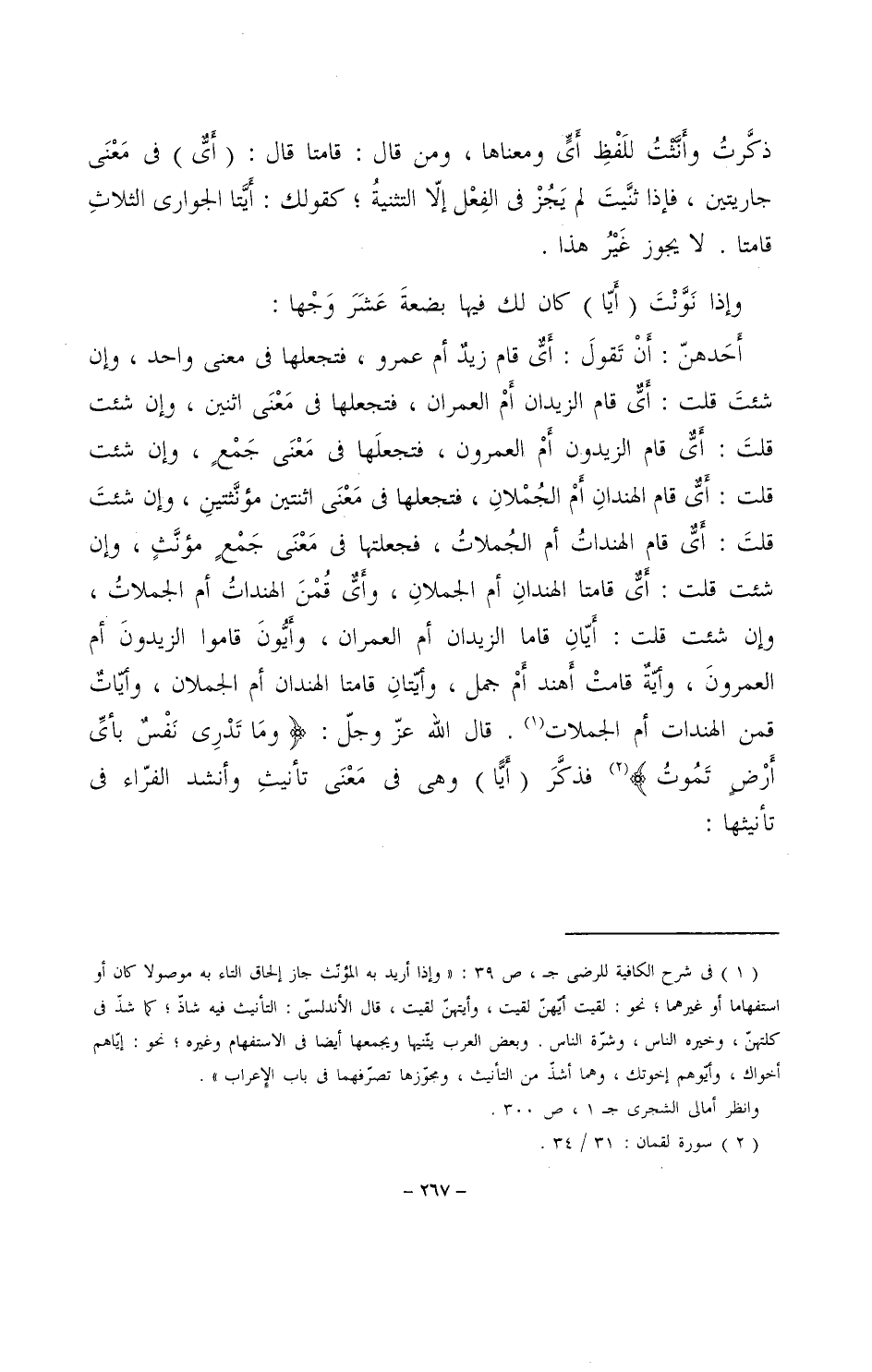 أحدهن: أن تقول: أي قام زيد أم عمرو، فتجعلها في معنى واحد، وإن شئت قلت: أي قام الزيدان أم العمران، فتجعلها في معنى اثنين، وإن شئت قلت: أي قام الزيدون أم العمرون، فتجعلها في معنى جمعٍ، وإن شئت قلت: أي قام الهندان أم الجملان، فتجعلها في معنى اثنتين مؤنثتين، وإن شئت قلت: أي قام الهندات أم الجملات، فجعلتها في معنى جمعٍ مؤنثٍ، وإن شئت قلت: أي قامتا الهندان أم الجملان، وأي قمن الهندات أم الجملات، وإن شئت قلت: أيان قاما الزيدان أم العمران، وأيون قاموا الزيدون أم العمرون، وأية قامت أهند أم أجمل، وأيتان قامتا الهندان أم الجملان، وأيات قمن الهندات أم الجملات. قال الله عز وجل: (وما تدري نفس بأي أرضٍ تموت) فذكر (أيا) وهي في معنى تأنيث وأنشد الفراء في تأنيثها: