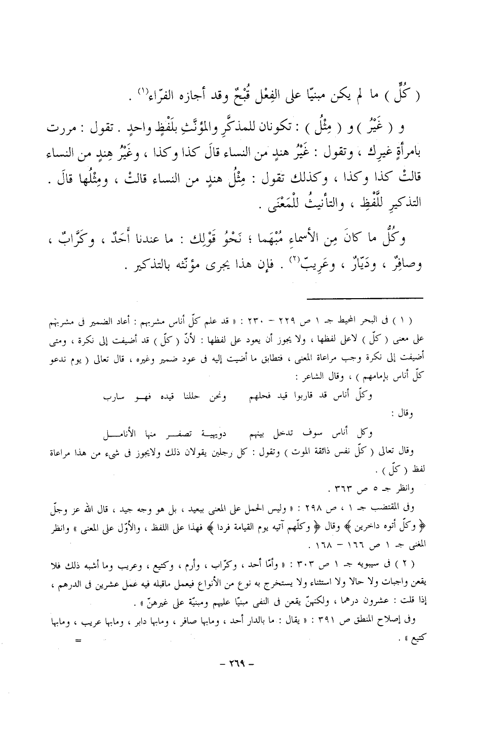 و (غير) و (مثل): تكونان للمذكر والمؤنث بلفظٍ واحدٍ. تقول: مررت بامرأةٍ غيرك، وتقول: غير هندٍ من النساء قال كذا وكذا، وغير هندٍ من النساء قالت كذا وكذا، وكذلك تقول: مثل هندٍ من النساء قالت، ومثلها قال.