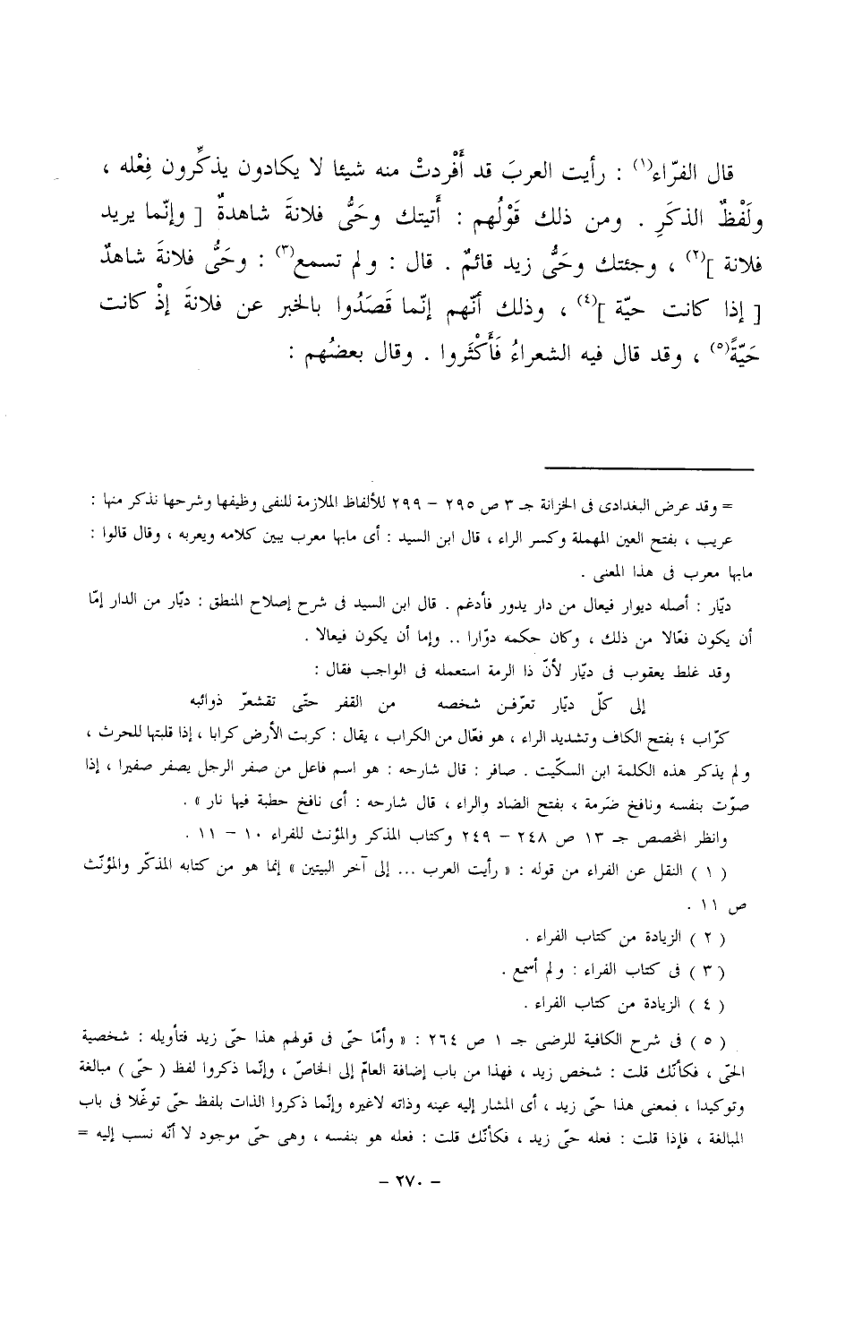 قال الفراء: رأيت العرب قد أفردت منه شيئًا لا يكادون يذكرون فعله، ولفظ الذكر. ومن ذلك قولهم: أتيتك وحي فلانة شاهدة [وإنما يريد فلانة]، وجئتك وحي زيد قائم. قال: ولم تسمع: وحي فلانة شاهد [إذا كانت حية]، وذلك أنهم إنما قصدوا بالخبر عن فلانة إذ كانت حية، وقد قال فيه الشعراء فأكثروا. وقال بعضهم: