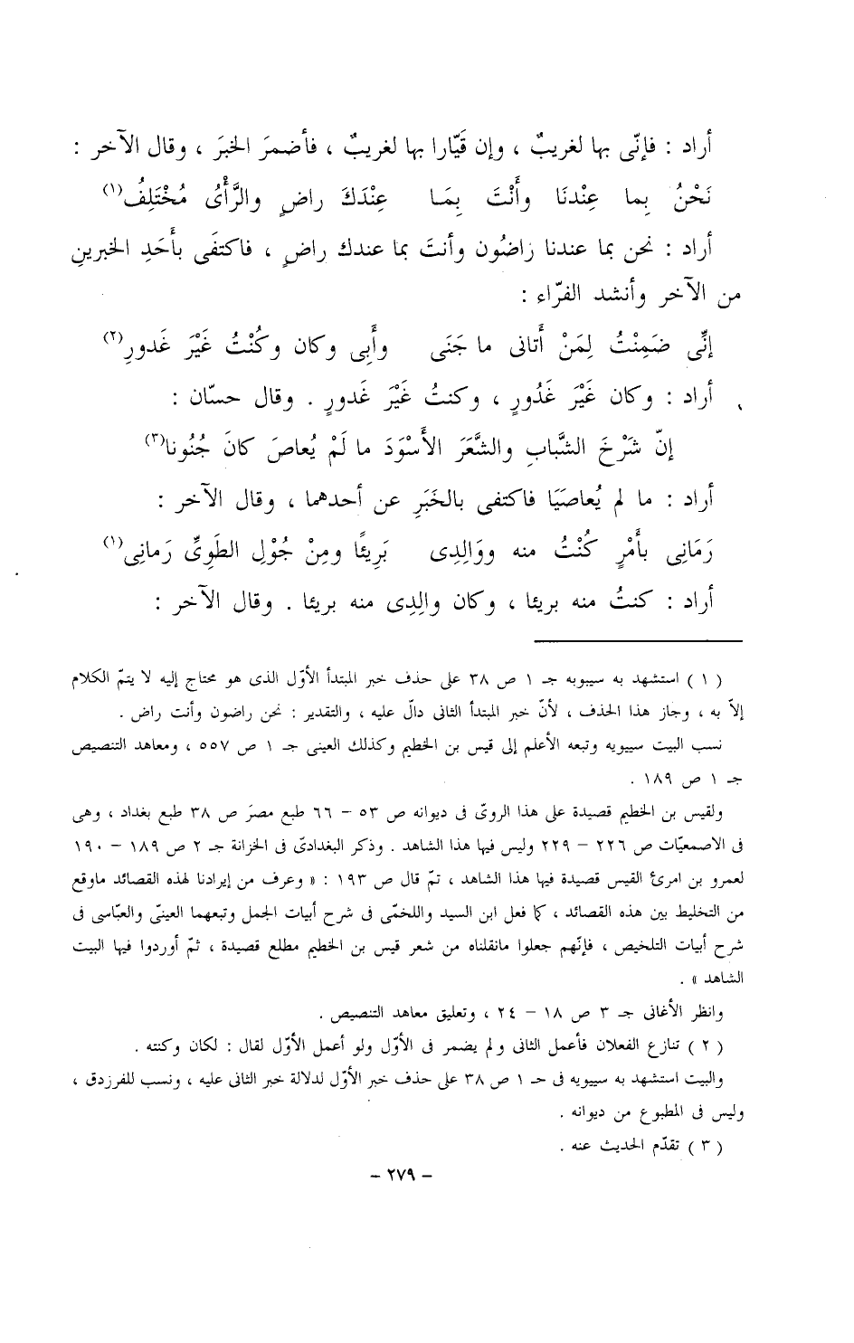 أراد: نحن بما عندنا راضون وأنت بما عندك راضٍ، فاكتفى بأحد الخبرين من الآخر وأنشد الفراء: