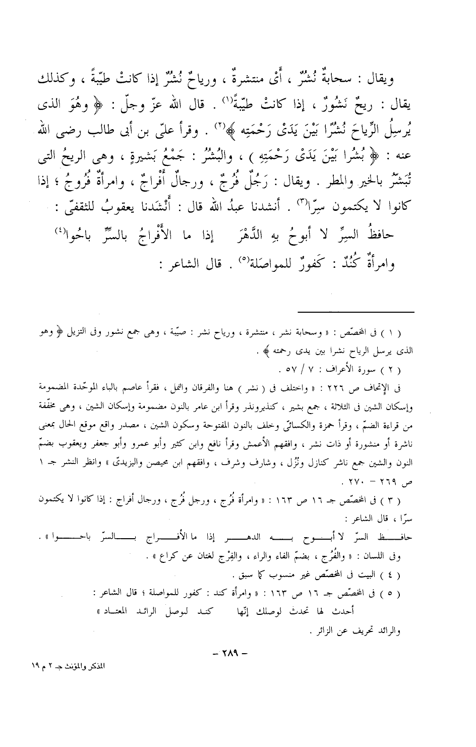 ويقال: سحابة نشر، أي منتشرة، ورياح نشر إذا كانت طيبة، وكذلك يقال: ريح نشور، إذا كانت طيبة. قال الله عز وجل: (وهو الذي يرسل الرياح نشرا بين يدي رحمته). وقرأ على بن أبي طالب رضي الله عنه: (بشرا بين يدي رحمته)، والبشر: جمع بشيرةٍ، وهي الريح التي تبشر بالخير والمطر. ويقال: رجل فرج، ورجال أفراج، وامرأة فروج؛ إذا كانوا لا يكتمون سرا. أنشدنا عبد الله قال: أنشدنا يعقوب للثقفي: