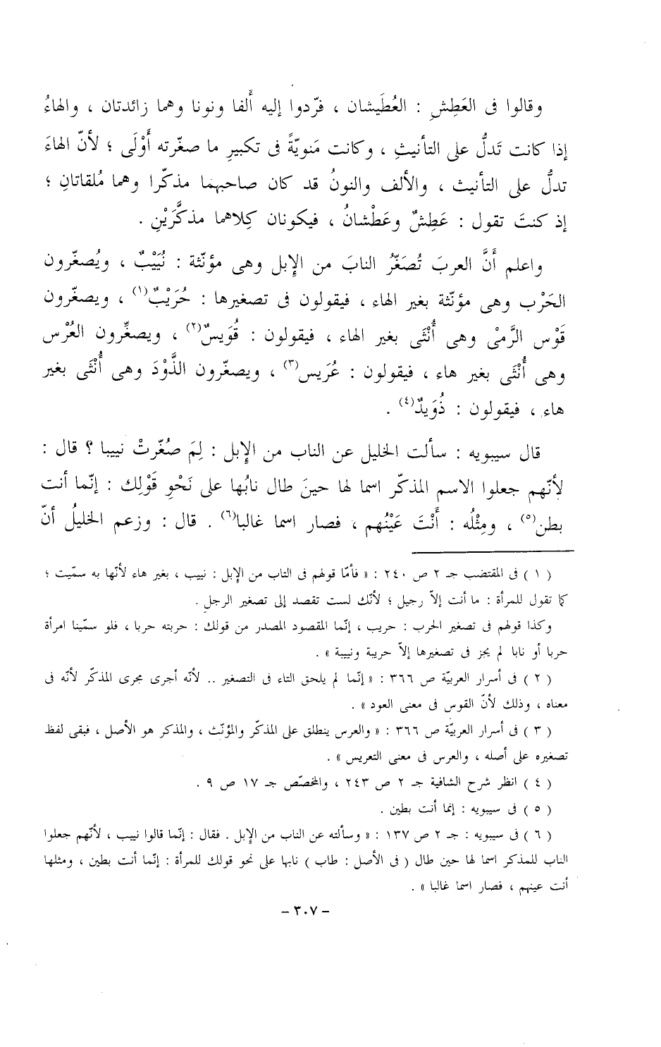 واعلم أن العرب تصغر الناب من الإبل وهي مؤنثة: نييب، ويصغرون الحرب وهي مؤنثة بغير الهاء، فيقولون في تصغيرها: حريب، ويصغرون قوس الرمي وهي أنثى بغير الهاء، فيقولون: قويس، ويصغرون العرس وهي أنثى بغير هاء، فيقولون: عريس، ويصغرون الذود وهي أنثى بغير هاء، فيقولون: ذويد.