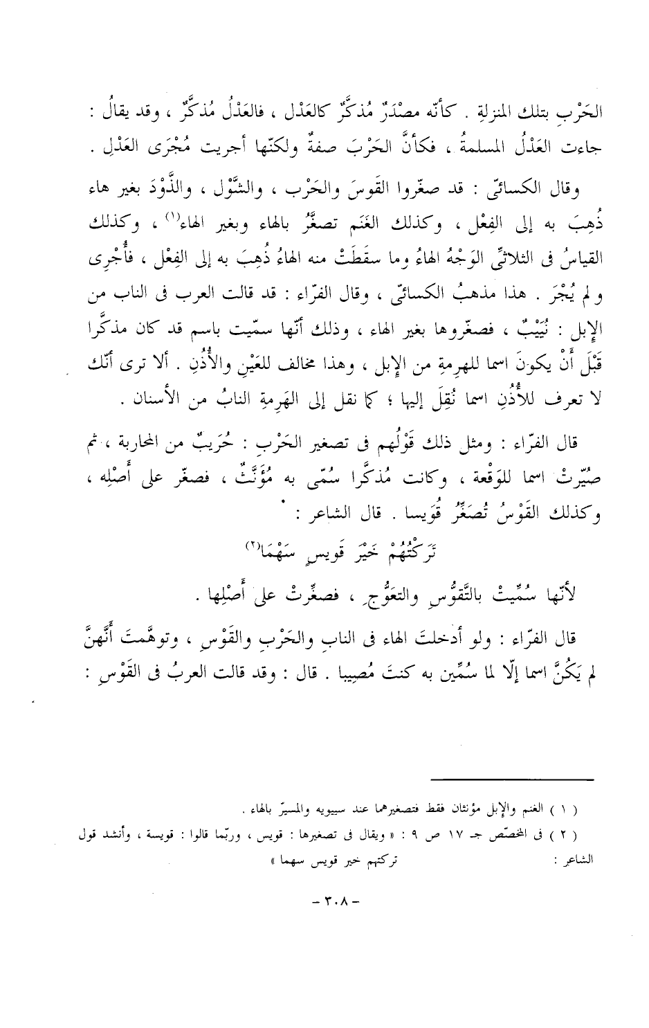 وقال الكسائي: قد صغروا القوس والحرب، والشول، والذود بغير هاء ذهب به إلى الفعل، وكذلك الغنم تصغر بالهاء وبغير الهاء، وكذلك القياس في الثلاثي الوجه الهاء وما سقطت منه الهاء ذهب به إلى الفعل، فأجرى ولم يجر. هذا مذهب الكسائي، وقال الفراء: قد قالت العرب في الناب من الإبل: نييب، فصغروها بغير الهاء، وذلك أنها سميت باسم قد كان مذكرًا قبل أن يكون اسمًا للهرمة من الإبل، وهذا مخالف للعين والأذن. ألا ترى أنك لا تعرف للأذن اسمًا نقل إليها؛ كما نقل إلى الهرمة الناب من الأسنان.