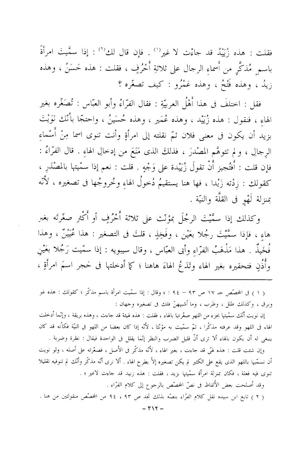 فقل: اختلف في هذا أهل العربية: فقال الفراء وأبو العباس: تصغره بغير الهاء، فنقول: هذه زييد، وهذه عمير، وهذه حسين، واحتجا بأنك نويت بزيد أن يكون في معنى فلان ثم نقلته إلى امرأةٍ وأنت تنوي اسمًا من أسماء الرجال، ولم تتوهم المصدر، فذلك الذي منع من إدخال الهاء. قال الفراء: فإن قلت: أفتجيز أن تقول زييدة على وجهٍ. قلت: نعم إذا سميتها بالمصدر، كقولك: زدته زيدا، فها هنا يستقيم دخول الهاء وخروجها في تصغيره، لأنه بمنزلة لهوٍ في القلة والنية.