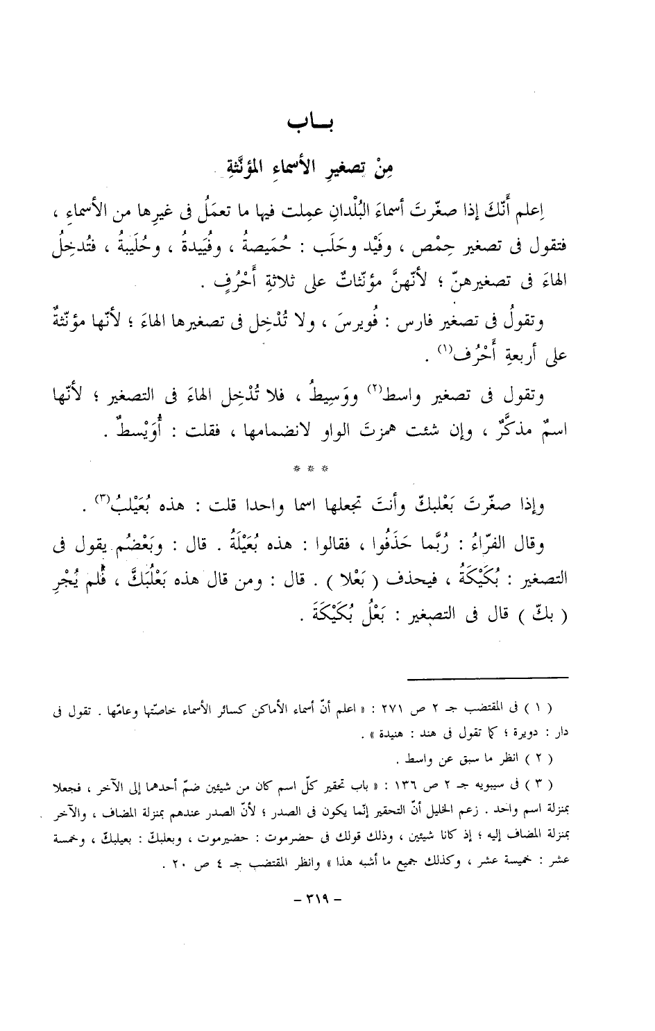 اعلم أنك إذا صغرت أسماء البلدان عملت فيها ما تعمل في غيرها من الأسماء، فتقول في تصغير حمص، وفيد وحلب: حميصة، وفييدة، وحليبة، فتدخل الهاء في تصغيرهن؛ لأنهن مؤنثات على ثلاثة أحرفٍ.