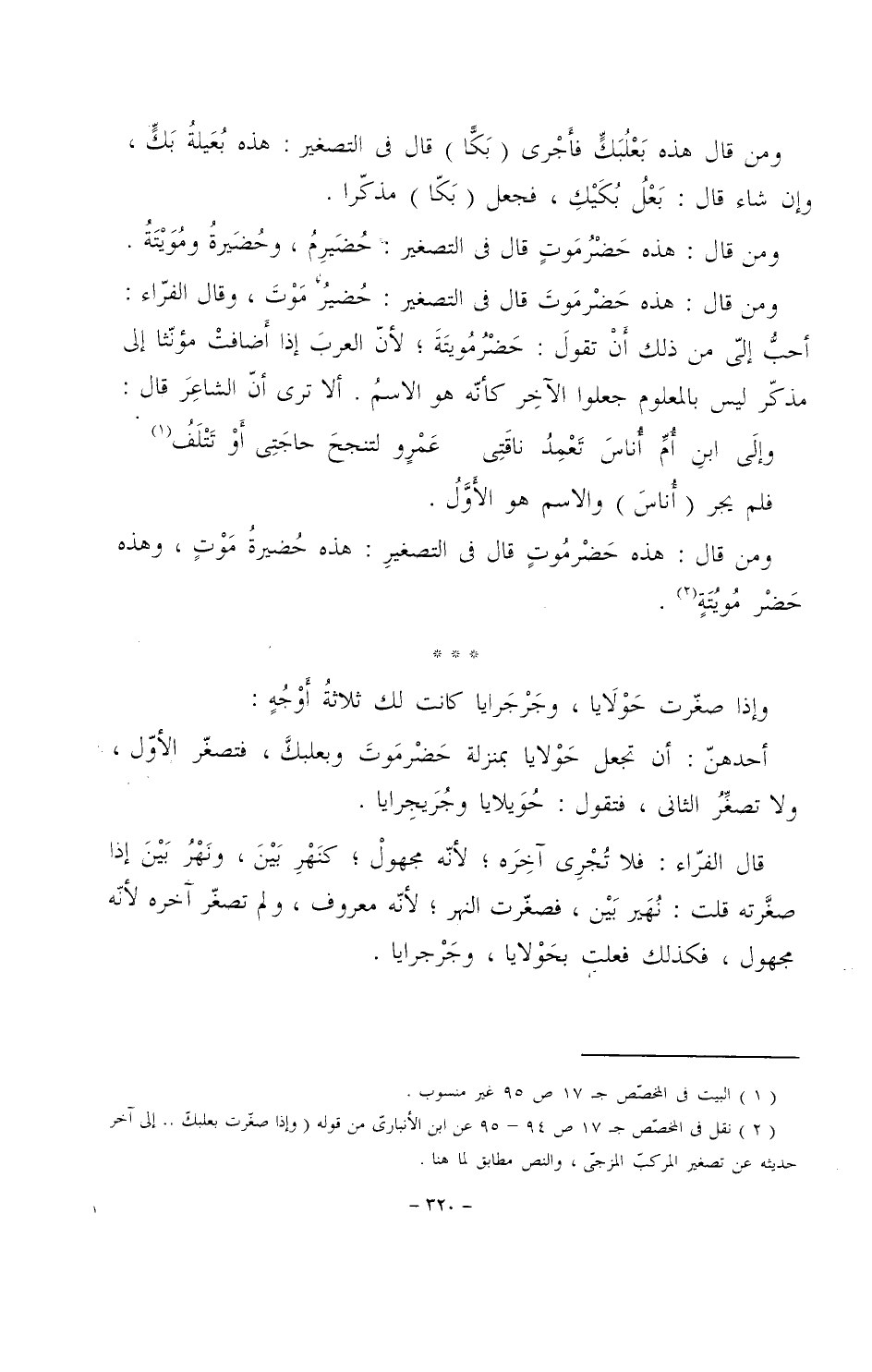 قال الفراء: فلا تجرى آخره؛ لأنه مجهول؛ كنهر بين، ونهر بين إذا صغرته قلت: نهير بين، فصغرت النهر؛ لأنه معروف، ولم تصغر آخره لأنه مجهول، فكذلك فعلت بحولايا، وجرجرايا.