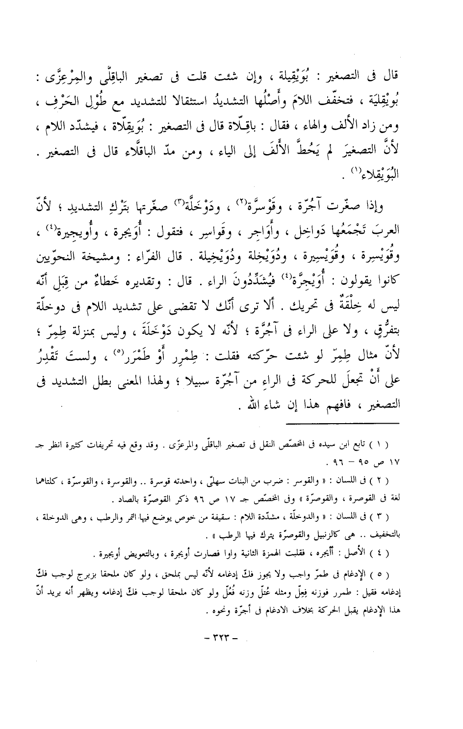 قال في التصغير: بويقيلة، وإن شئت قلت في تصغير الباقلي والمرعزي: بويقلية، فتخفف اللام وأصلها التشديد استثقالاً للتشديد مع طول الحرف، ومن زاد الألف والهاء، فقال: باقلاة قال في التصغير: بويقلاة، فيشدد اللام، لأن التصغير لم يحط الألف إلى الياء، ومن مد الباقلاء قال في التصغير. البويقلاء.