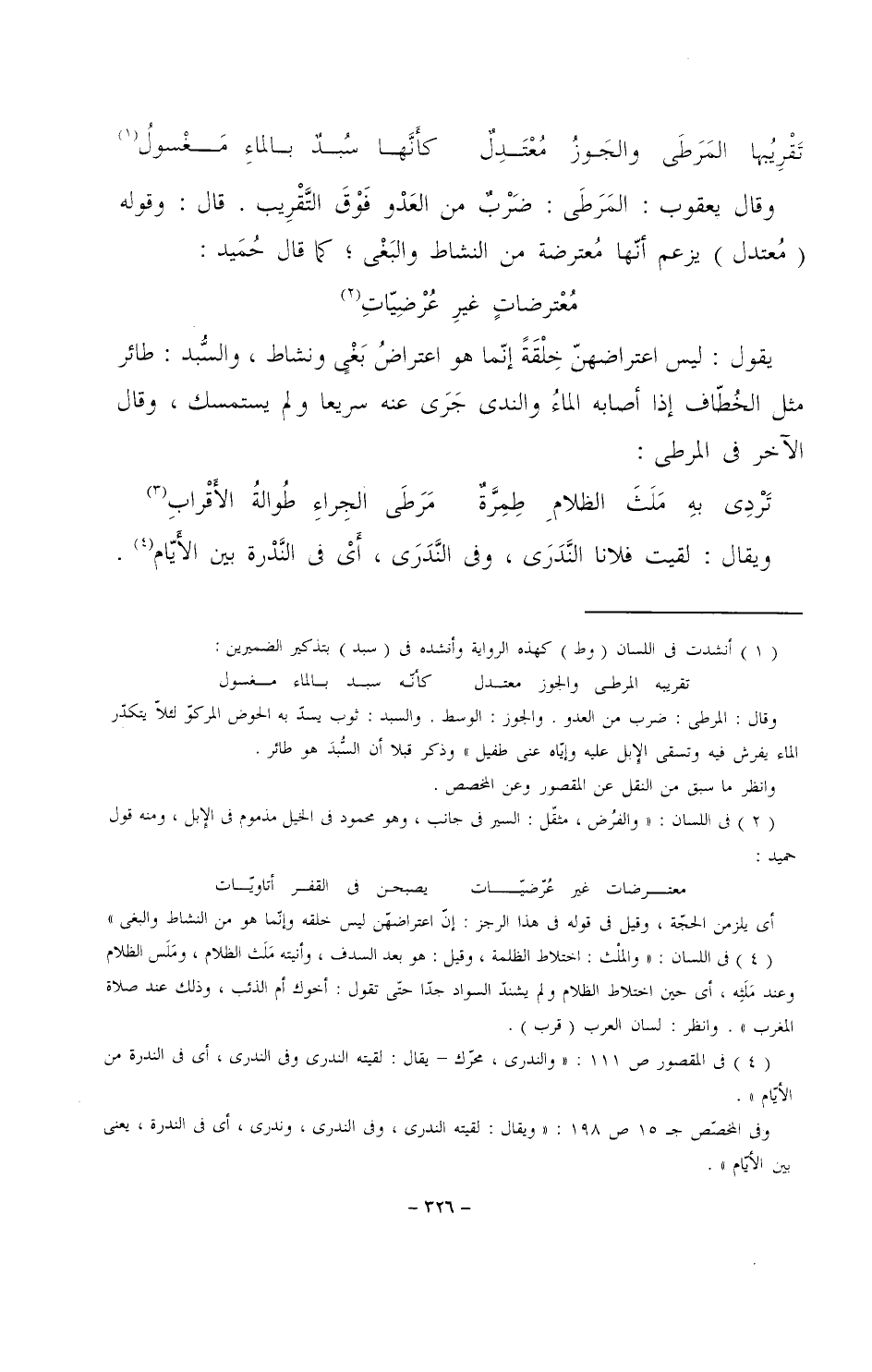 وقال يعقوب: المرطي: ضرب من العدو فوق التقريب. قال: وقوله (معتدل) يزعم أنها معترضة من النشاط والبغي؛ كما قال حميد: