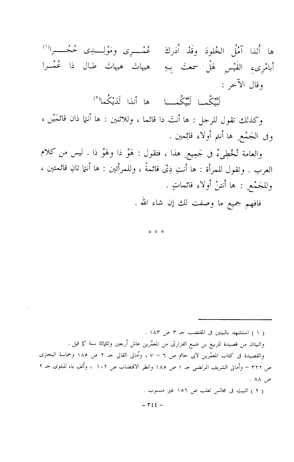 وكذلك تقول للرجل: ها أنت ذا قائما، وللاثنين: ها أنتما ذان قائمين، وفي الجمع ها أنتم أولاء قائمين.