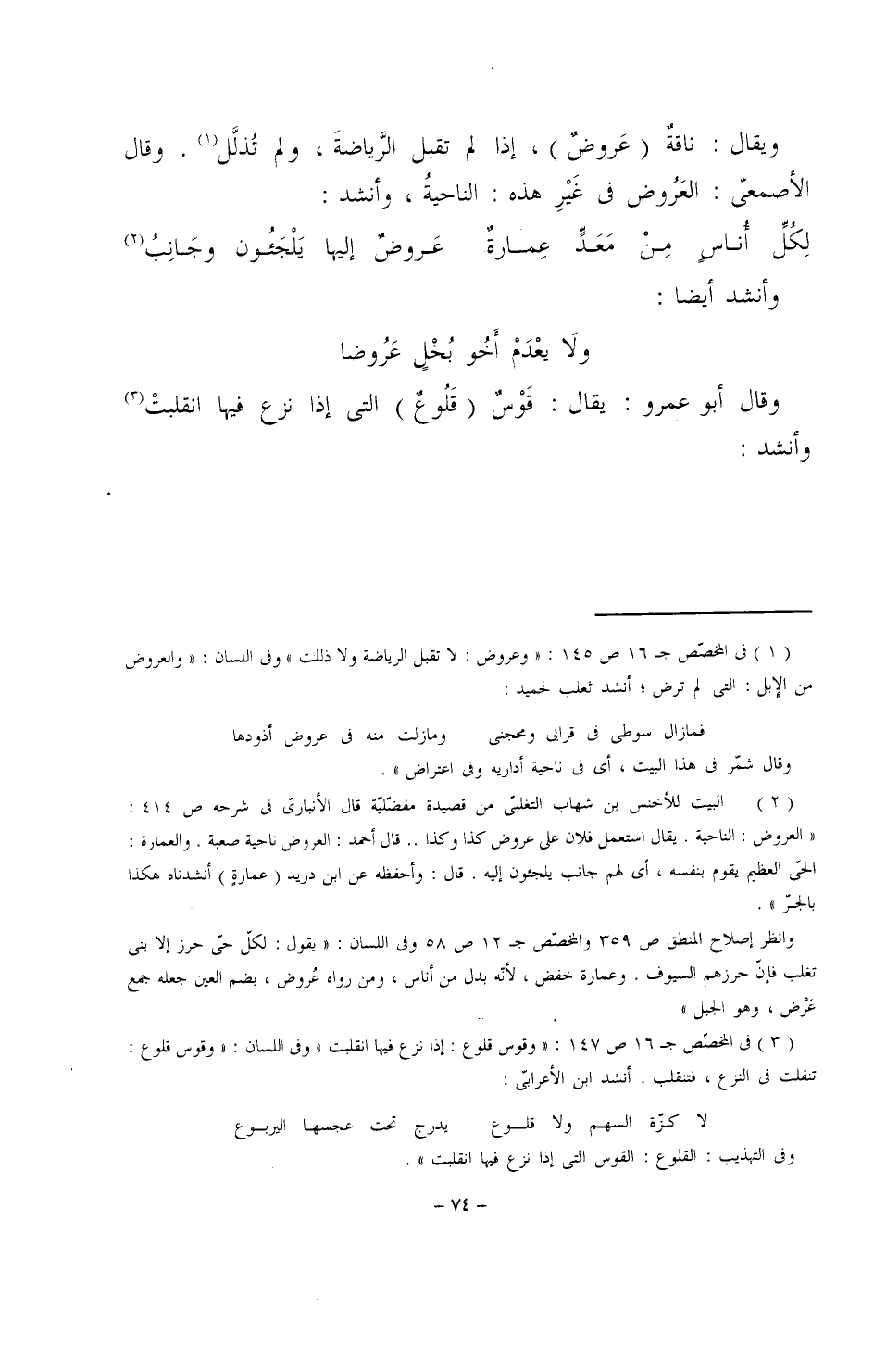 ويقال: ناقةٌ (عروضٌ)، إذا لم تقبل الرياضة، ولم تُذلل. وقال الأصمعي: العَرُوض في غيرِ هذه: الناحيةُ، وأنشد: