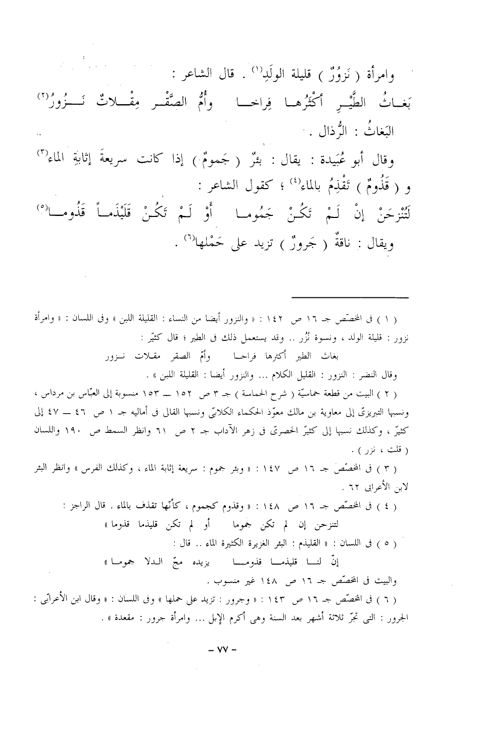 وامرأة (نَزورٌ) قليلة الولدِ. قال الشاعر: